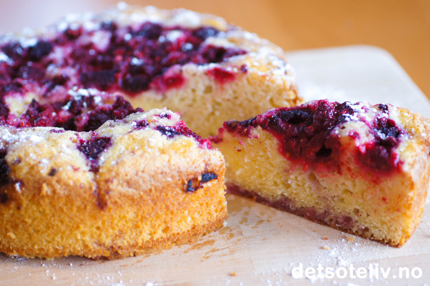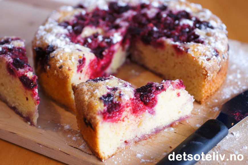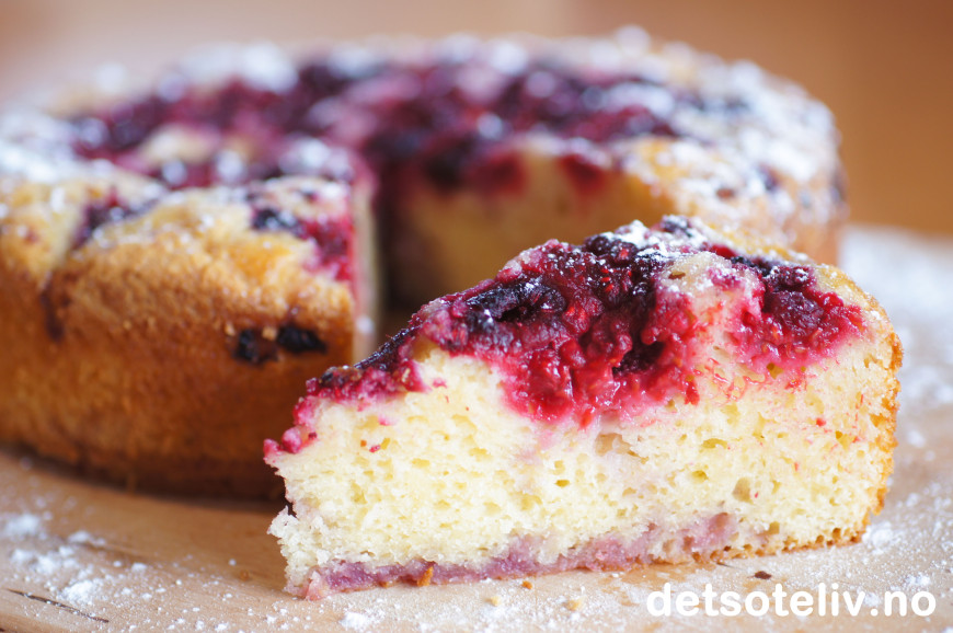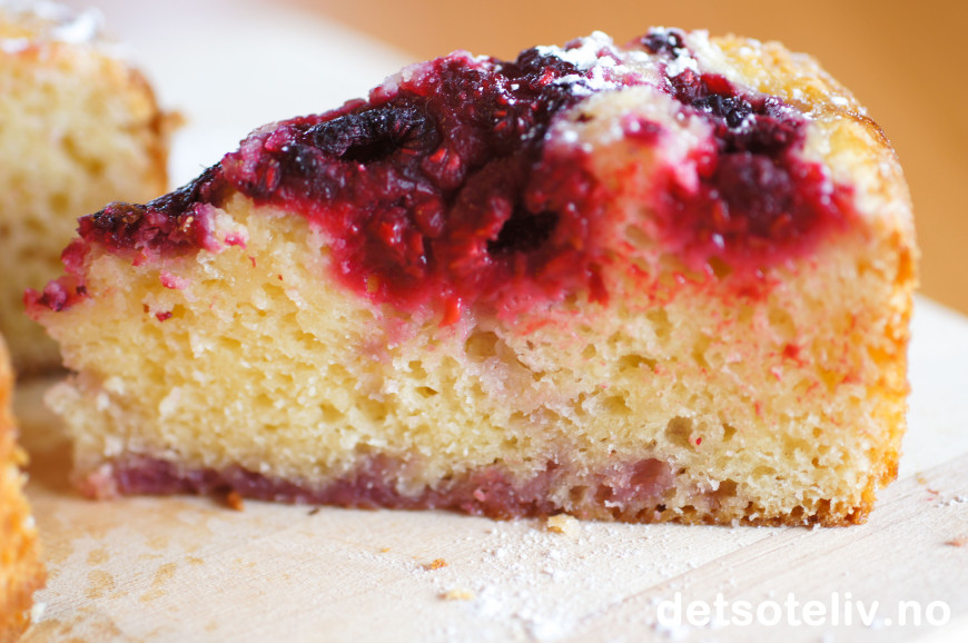 ♥ Merk at de bringebærene gjør at kaken trenger litt lenger steketid enn det som er vanlig for Rømmekake, i hvert fall dersom du bruker frosne bringebær.