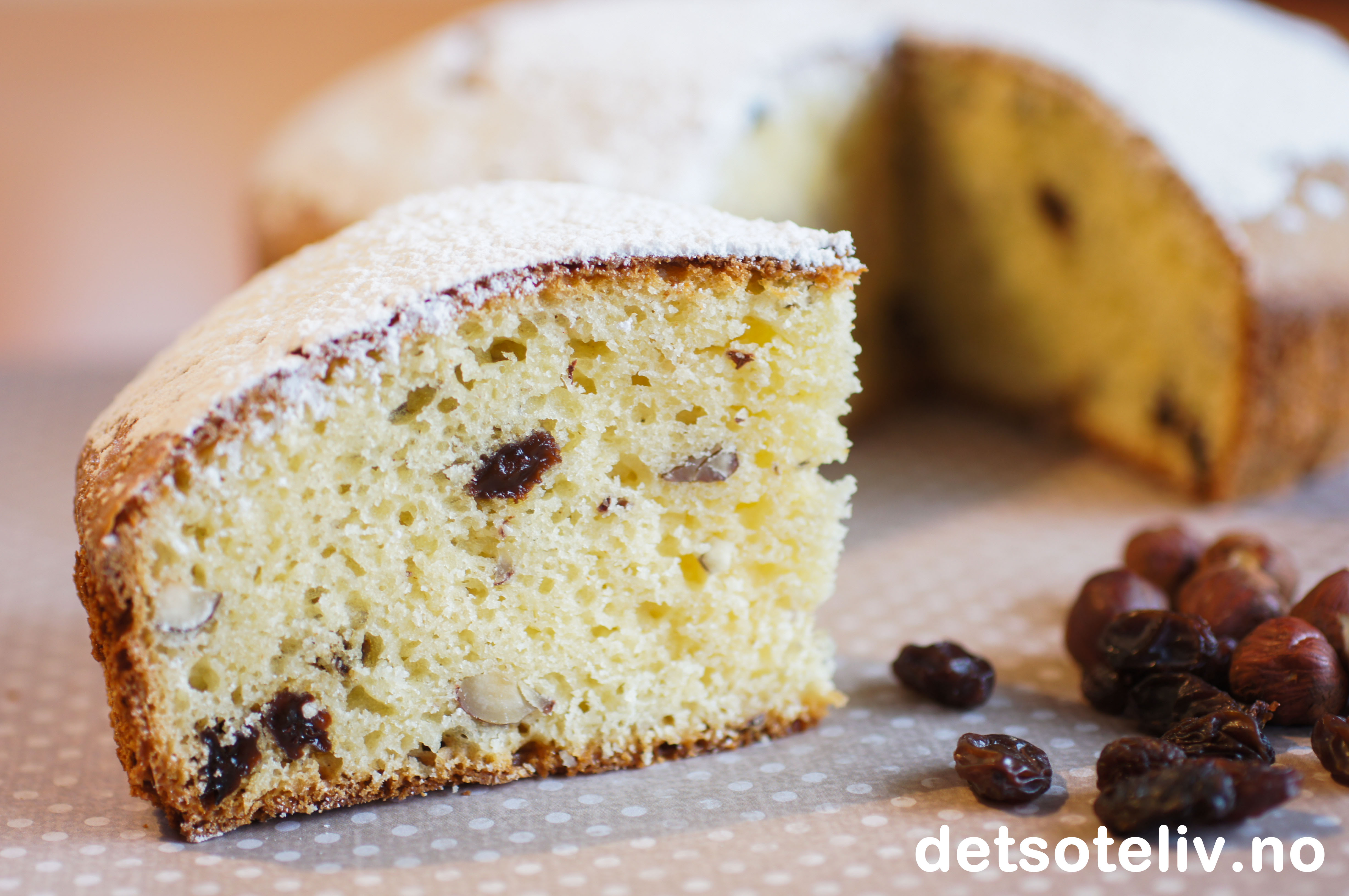 Pisk egg og sukker sammen i en bakebolle med stålvisp (du trenger ikke å piske eggedosis!). Visp inn rømmen og bakepulver. Hakk nøttene. Bland rosiner og nøtter sammen med hvetemelet (dette forhindrer at rosinene og nøttene synker til bunnen av kaken under stekingen). Ha dette så i deigen og rør sammen.