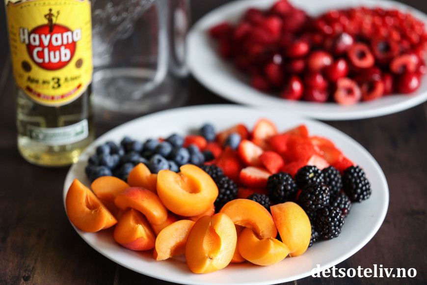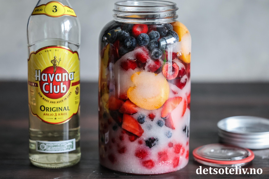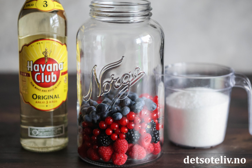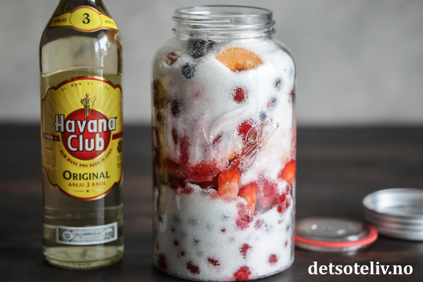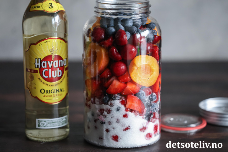 Her legges en blanding av bær og frukter på en krukke sammen med rom og sukker. Dette skal stå mørkt og kjølig og godgjøre seg i 2–3 måneder!
