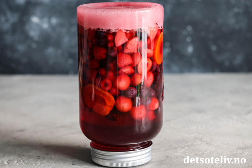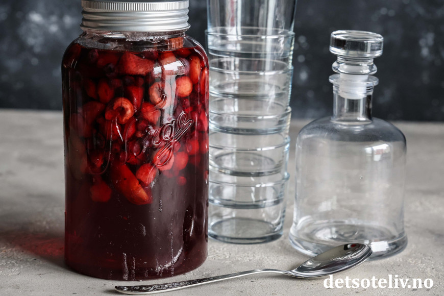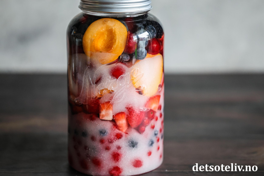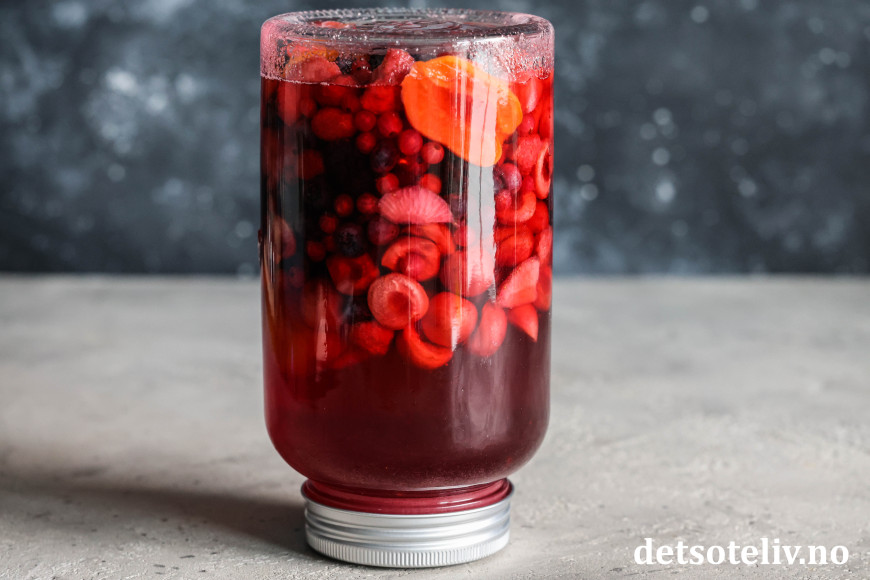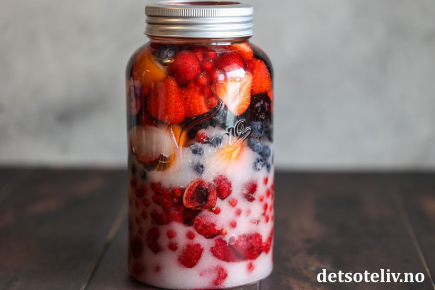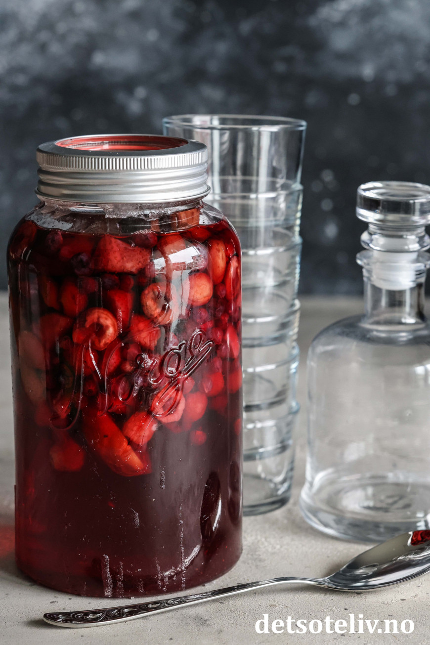 Her legges en blanding av bær og frukter på en krukke sammen med rom og sukker. Dette skal stå mørkt og kjølig og godgjøre seg i 2–3 måneder!