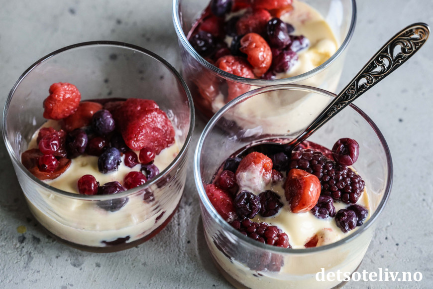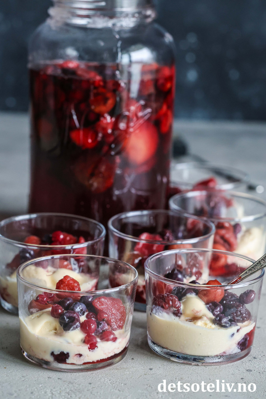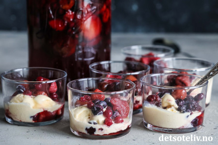 Bærene serveres med vaniljeis eller pisket krem, og saften som du får til overs kan siles og nytes som likør.