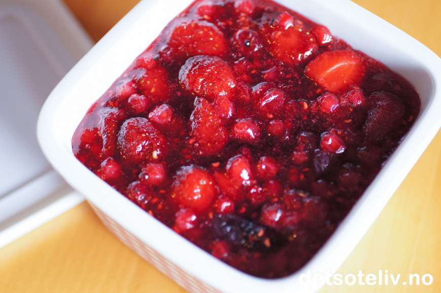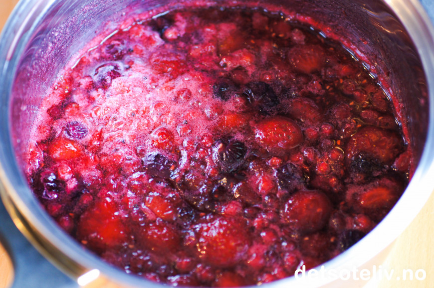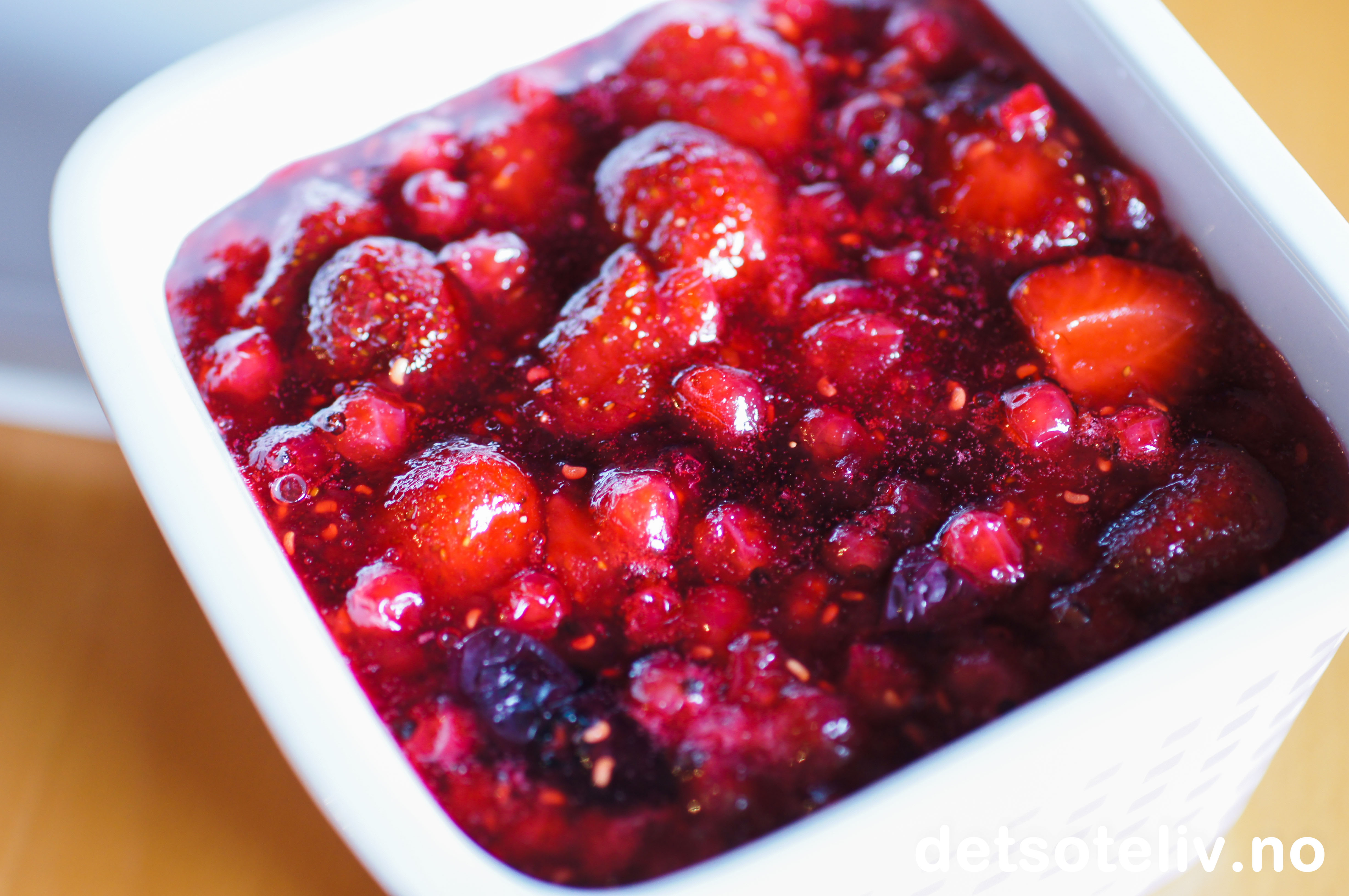 Bruk sommerens bær av alle slag og rør sammen med sukker til nydelig sommersyltetøy! Jeg bruker jordbær, bringebær, rips, solbær og blåbær. Lett å lage og det smaker nydelig!