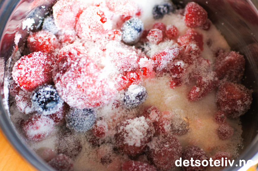 Frysepulveret blandes med sukkeret før sukkeret blandes med bærene.