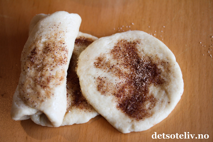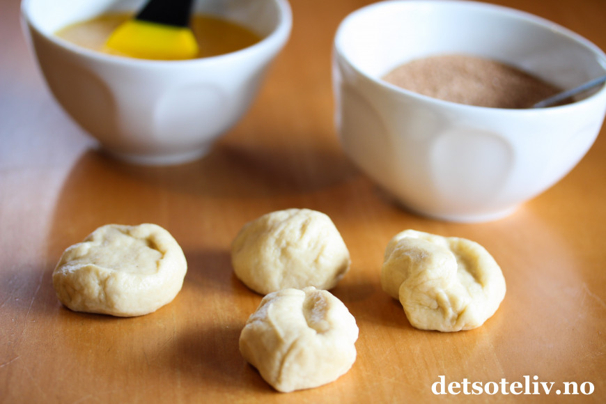 Del deigen først i 10 like store emner. Del deretter hvert av disse 10 emnene i 4 like stor biter. Trill hver bit til en kule og trykk disse flate mellom hendene. Smelt smør i en skål og bland sukker og kanel i en annen skål. Pensle hver deiglapp med smeltet smør og dryss på kanelsukker. Legg fire flate deigrundinger etter hverandre slik at de overlapper.