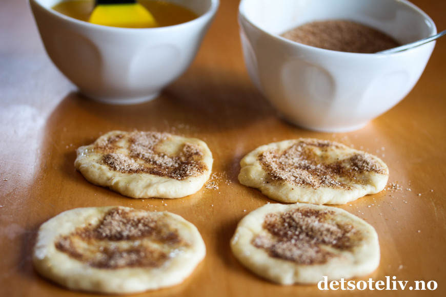 Pensle hver deiglapp med smeltet smør og dryss på kanelsukker.