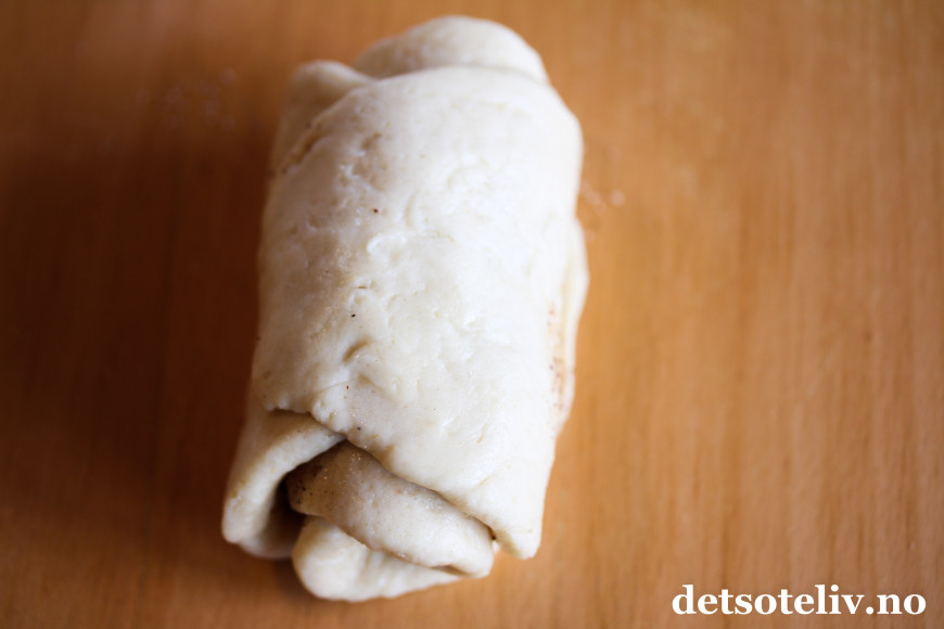 Start så fra venstre med å rulle de fire deigskivene sammen til en rull.