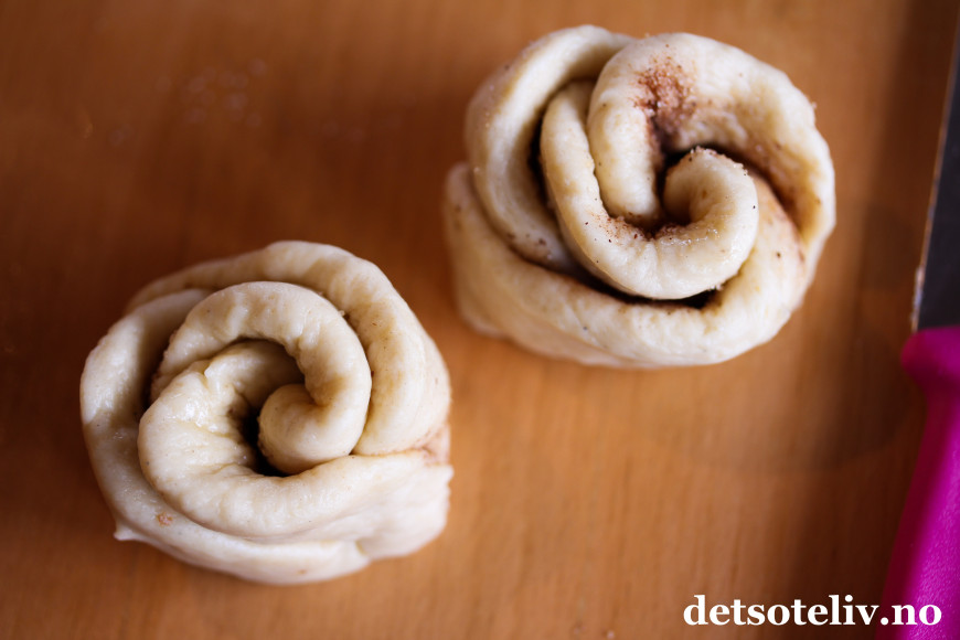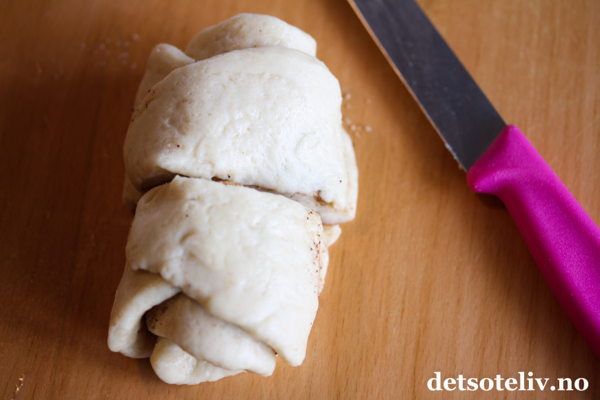 Start så fra venstre med å rulle de fire deigskivene sammen til en rull. Del rullen på midten med en kniv. Du vil da se at du får to boller som er flate på undersiden og som har rosemønster på oversiden.