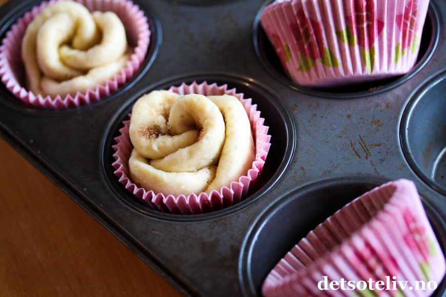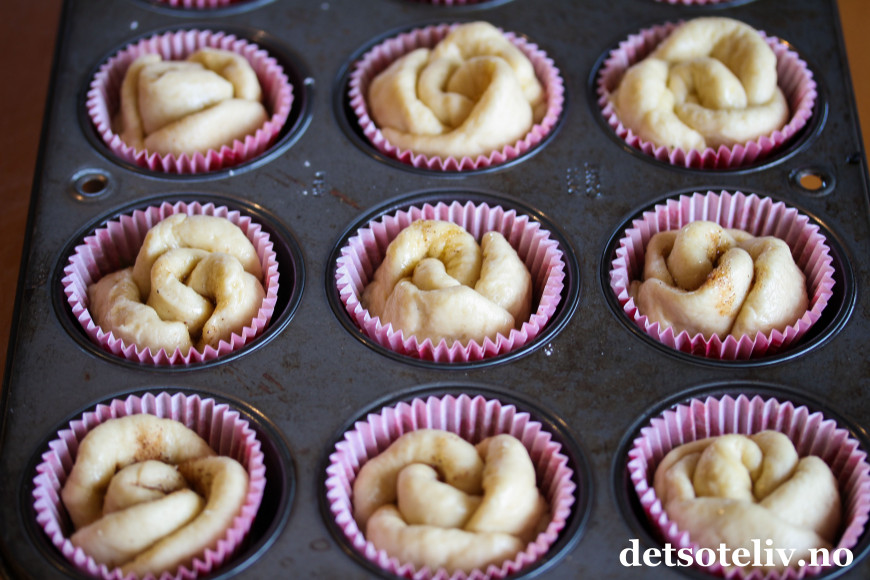 Sett hver roseformede bolle i muffinsformer som gjerne kan settes i muffinsbrett.