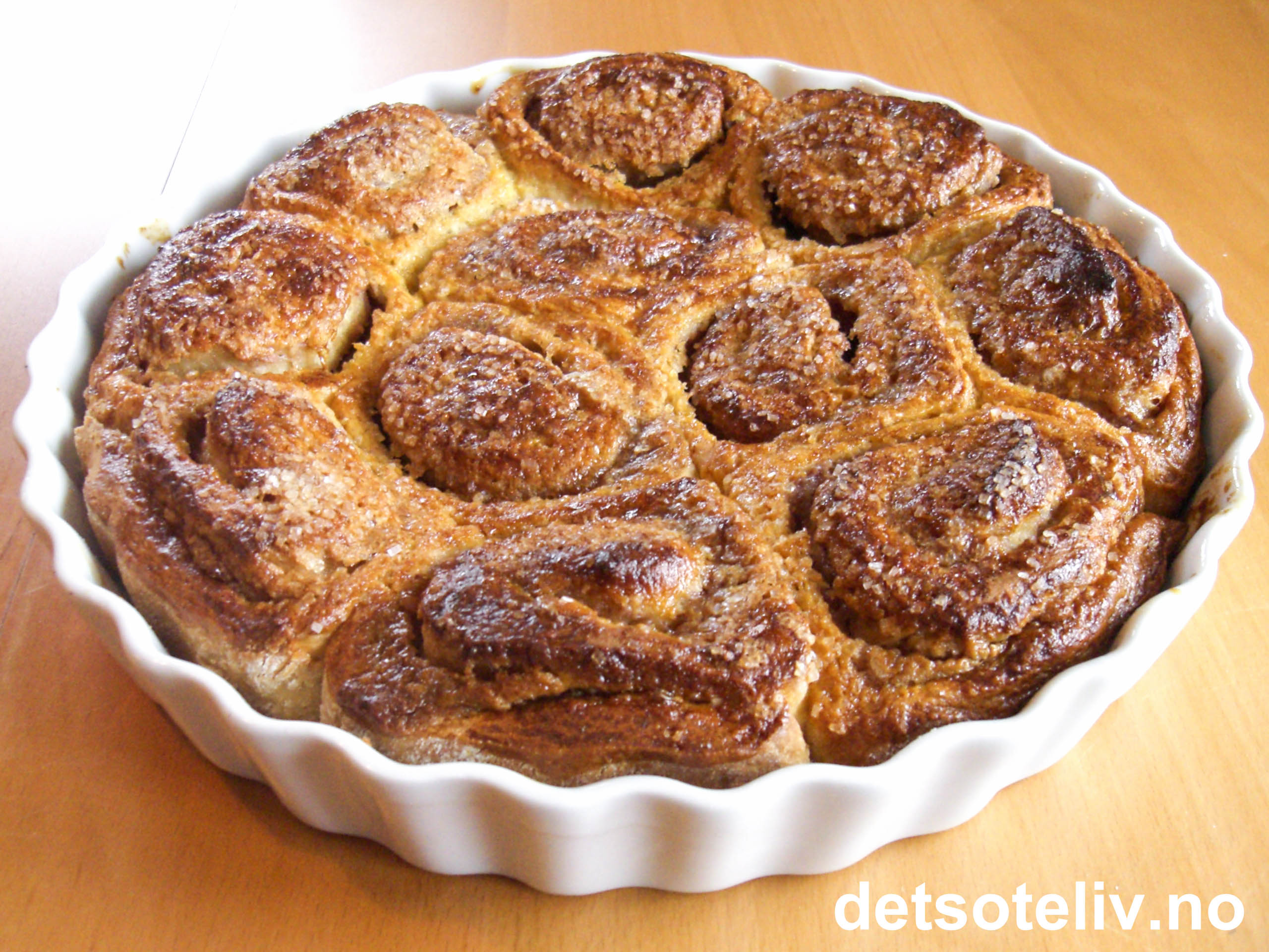 Smør en rund, ildfast form (27 cm i diameter) med smør og legg i passe antall deigskiver. Beregn plass mellom skivene, for de hever seg godt (se tips). La kaken heve i ca 1 time.
