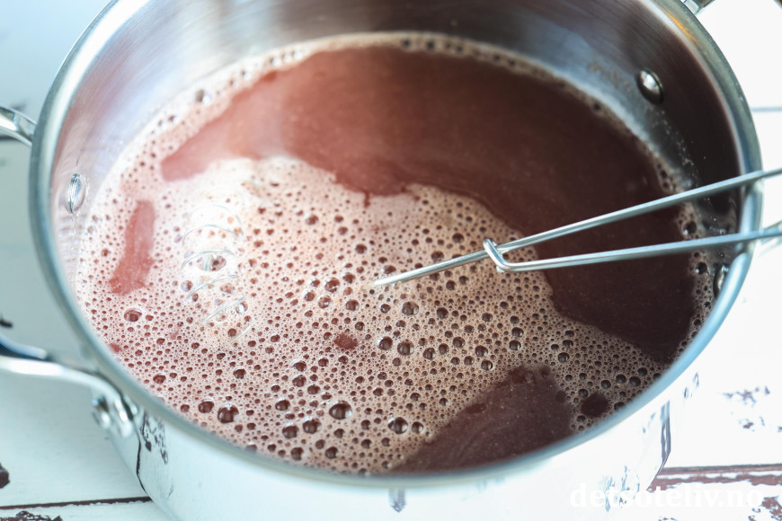 Sett kjelen på platen og gi blandingen et oppkok mens du visper hele tiden. Senk varmen på platen litt og la blandingen småkoke i ca. 10 minutter. Visp hele tiden så grøten ikke svir seg i bunnen av kjelen. Du vil etter hvert se at blandingen tykner i konsistensen og blir brunrød i fargen.