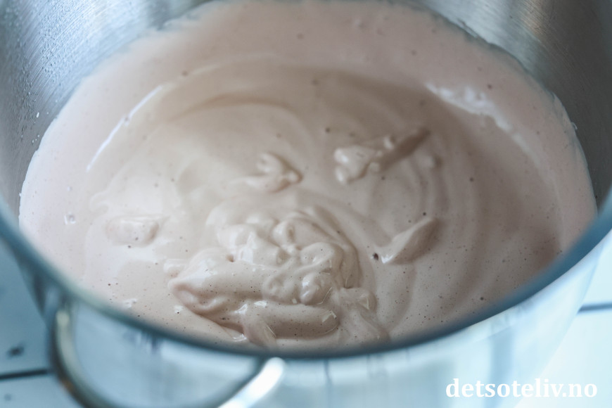 Hell grøten i en kjøkkenmaskin og starte å piske den, først på lav hastighet og deretter høyere hastighet. Grøten må piskes skikkelig kraftig og lenge, minst 10 minutter, før du ser at den blir til en skikkelig tykk, stiv og luftig krem. Fargen vil da være blek rosa.