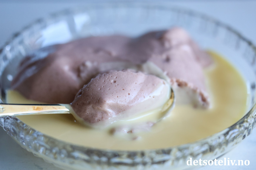 ♥ Jeg liker best å bruke vaniljesaus (bruk ferdigkjøpt eller aller helst hjemmelaget vaniljesaus). Alternativt kan du bruke fløtemelk (dvs. matfløte eller bruk kremfløte som du tynner ut med helmelk), men da blir desserten litt mindre søt. Du kan da eventuelt drysse litt sukker over i tillegg.