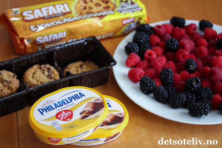 ♥ Jeg har her brukt Philadelfia kremost med sjokoladesmak. Får du ikke tak i dette produktet, går det like fint å smelte melkesjokolade og blande sjokoladen med vanlig kremost naturell. Bruk i så fall 100 g melkesjokolade (eller kokesjokolade hvis du liker sterkere sjokoladesmak) til 200 g kremost naturell. Smelt sjokoladen over vannbad eller i mikro, avkjøl sjokoladen og rør den deretter sammen med kremosten før du pisker inn melis og vaniljesukker.