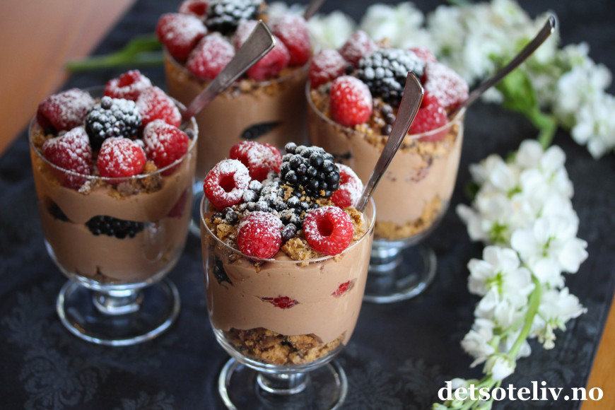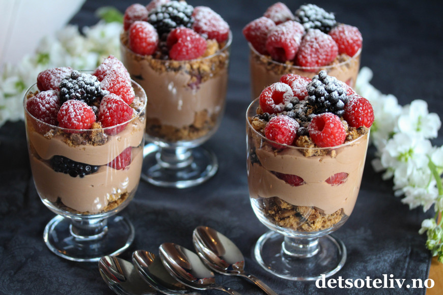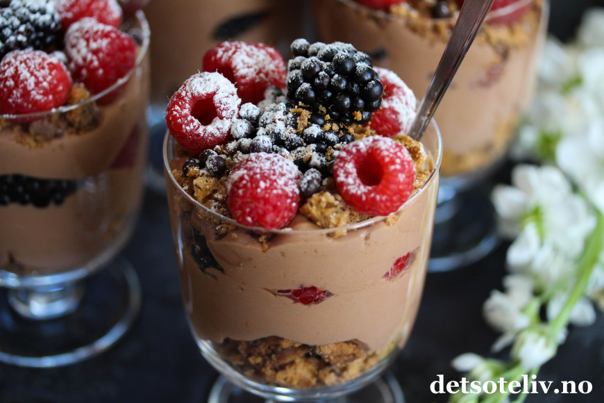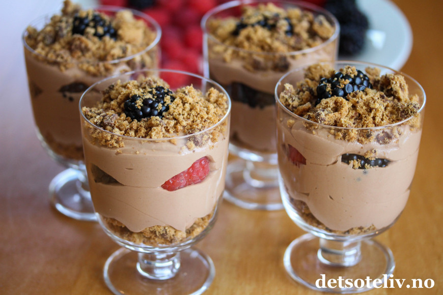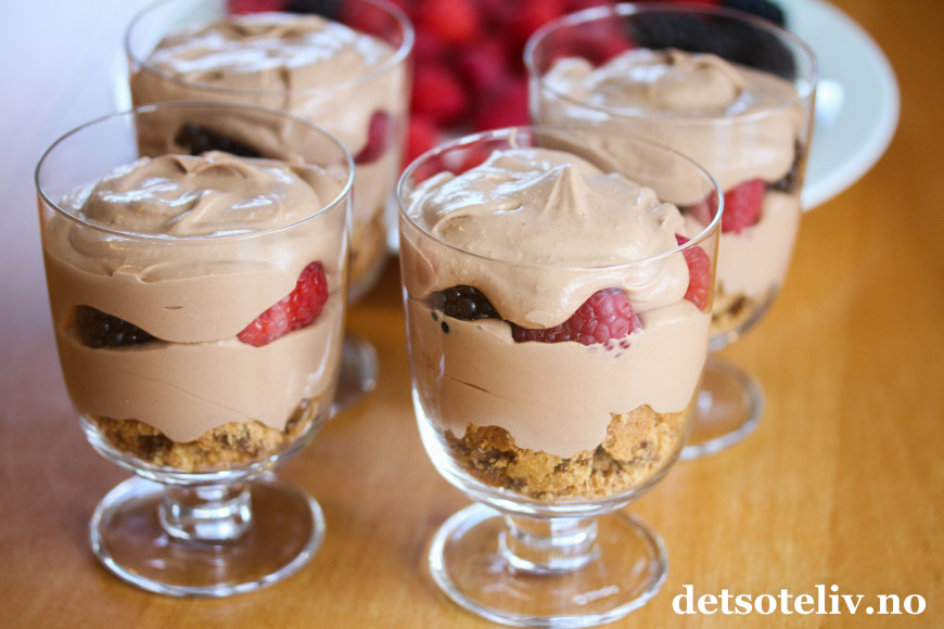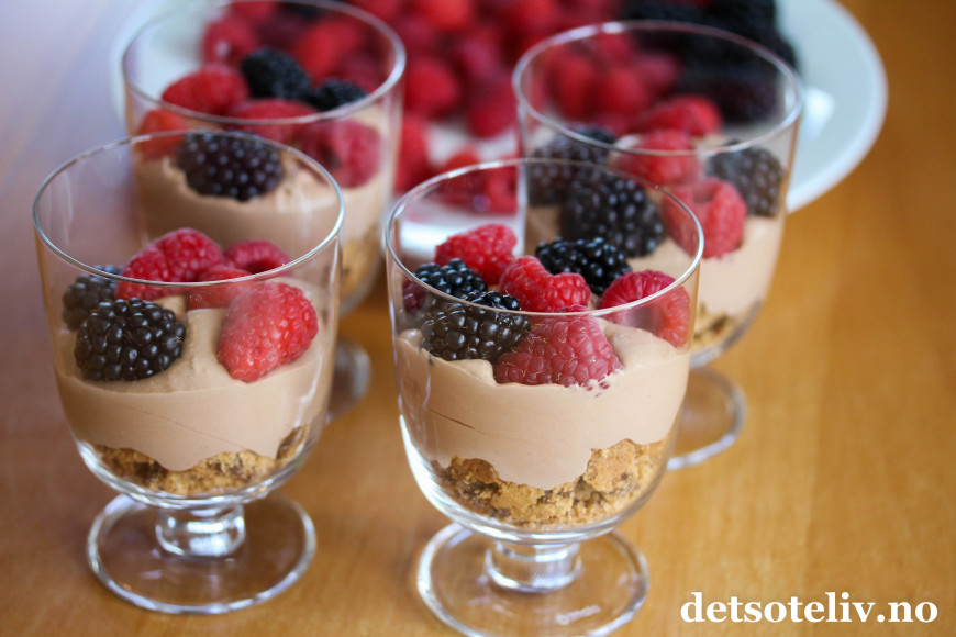 Ha over noen bær, og fyll opp glassene med resten av sjokoladekremen.