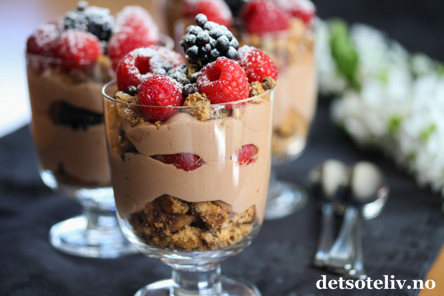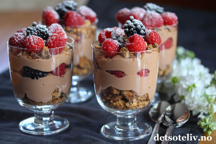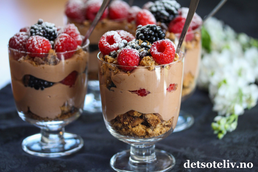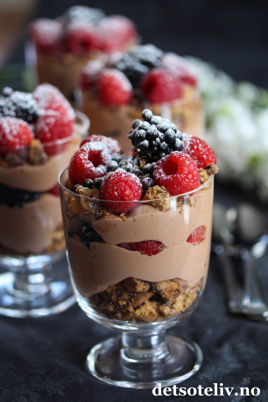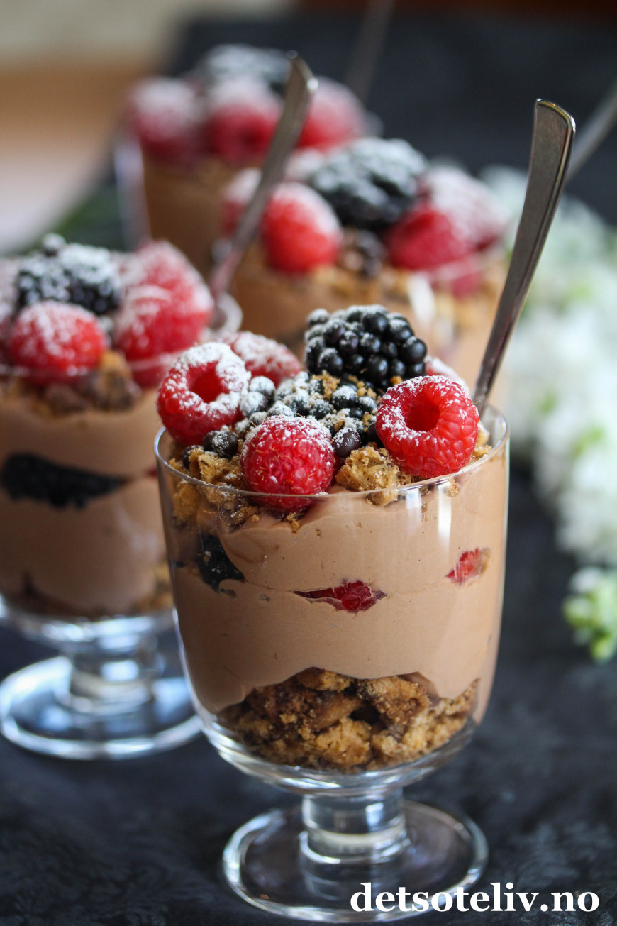 Ha over noen bær, og fyll opp glassene med resten av sjokoladekremen.