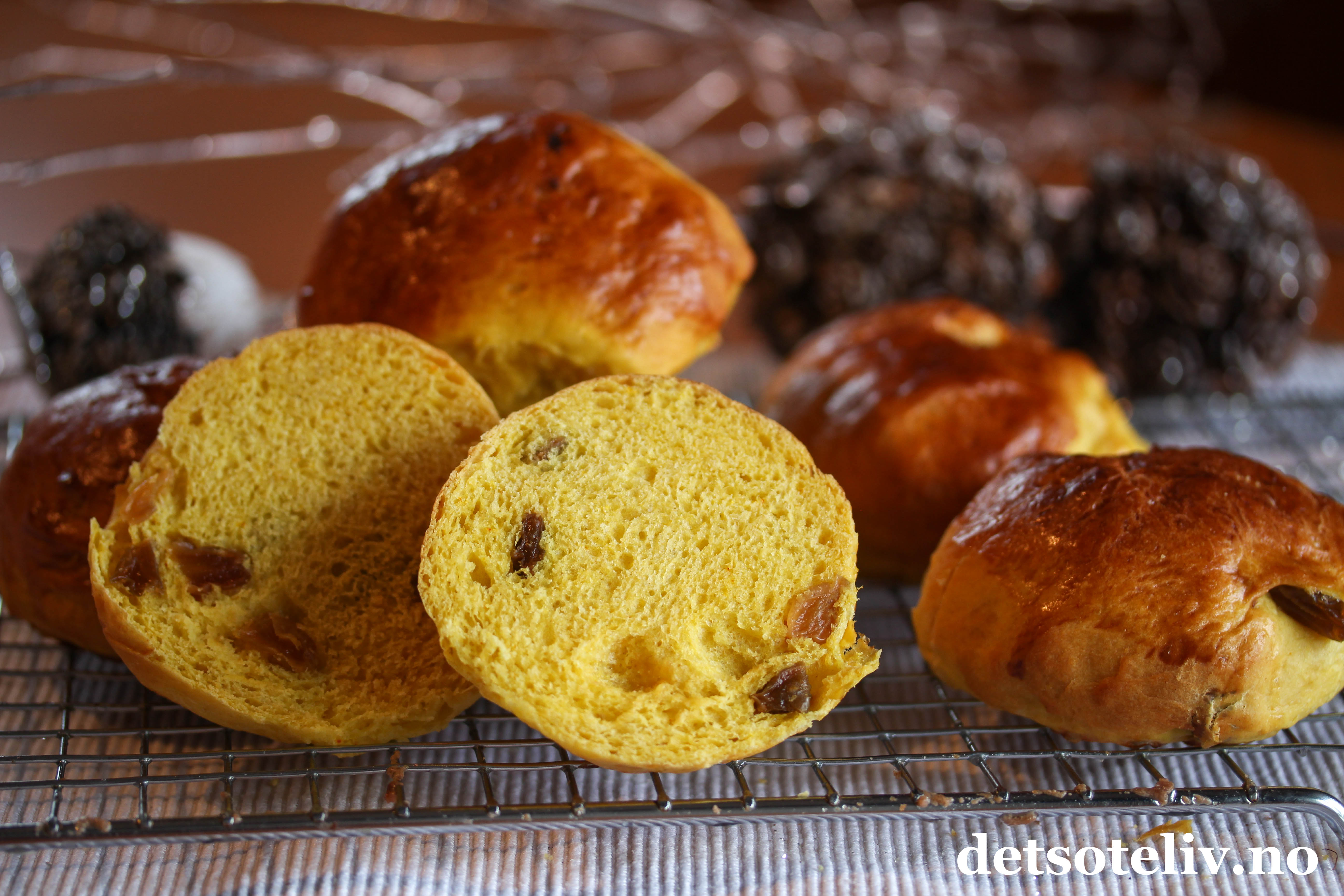 Safranboller inneholder lyse rosiner og safran, hvilket gir bollene en deilig smak og spennende gul farge. Deigen inneholder dessuten kesam, som gir helt spesielt myke boller. Bollene er laget av den samme deigen som Luciaboller og Lusseboller, men disse Safranbollene er så nøytrale av utseendet at det er ingen grunn til å bare lage dem til den 13. desember! Lag dem f.eks. til påske også!