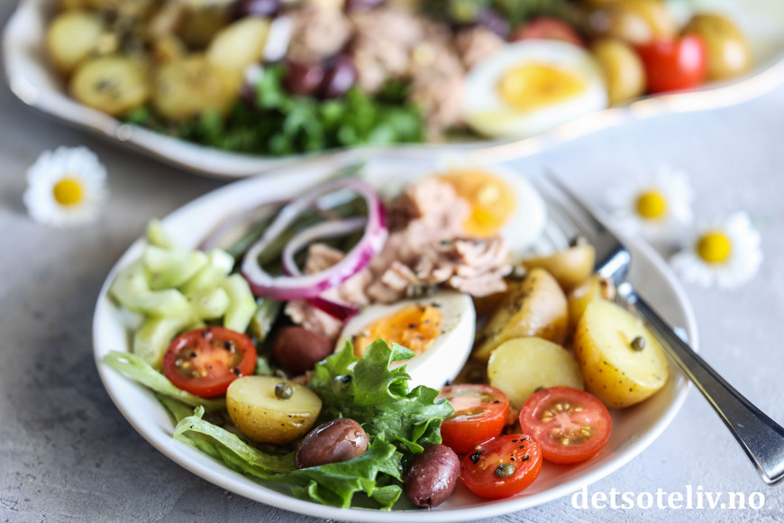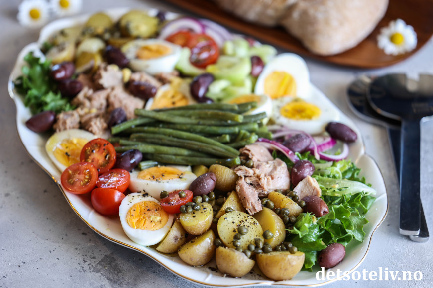 Salade niçoise (som betyr "Salat fra Nice" på fransk) er en av de mest berømte salatene, og har alltid vært en favoritt hos meg.