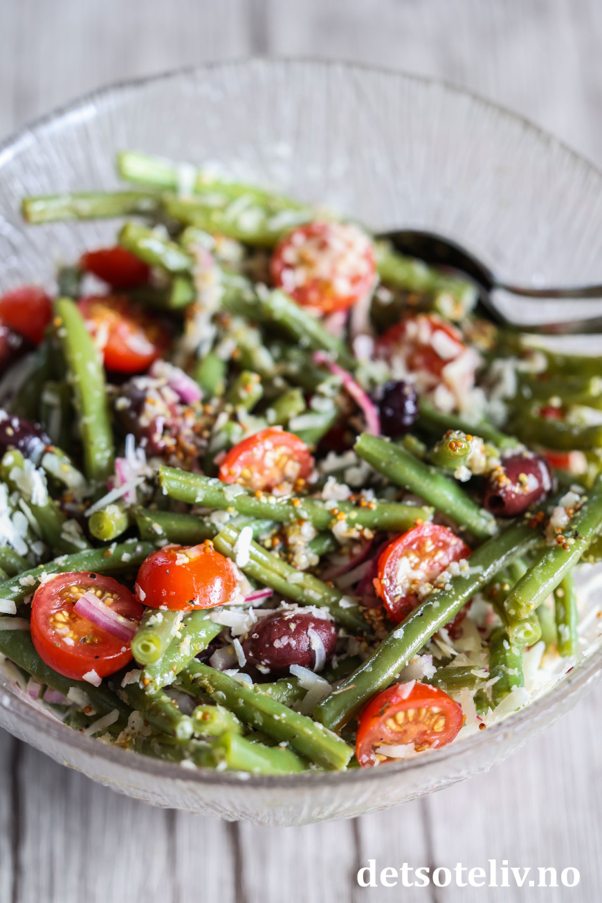 Her har du en dekorativ, italienskinspirert salat med grønne aspargesbønner og cherrytomater, som får kjempegod smak av sennepsdressing, rødløk, oliven og parmesan.