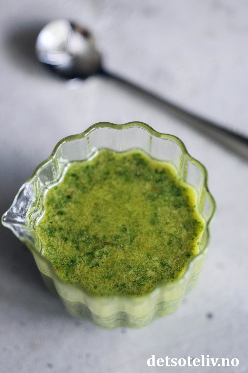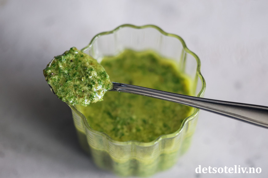 ♥ Juster tykkelsen på sausen med mengden olivenolje. Liker du sausen tynnere, er det bare å tilsette litt mer olje.