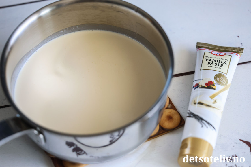 Ha kremfløte og vaniljepasta i en kjele. Gi blandingen et oppkok.