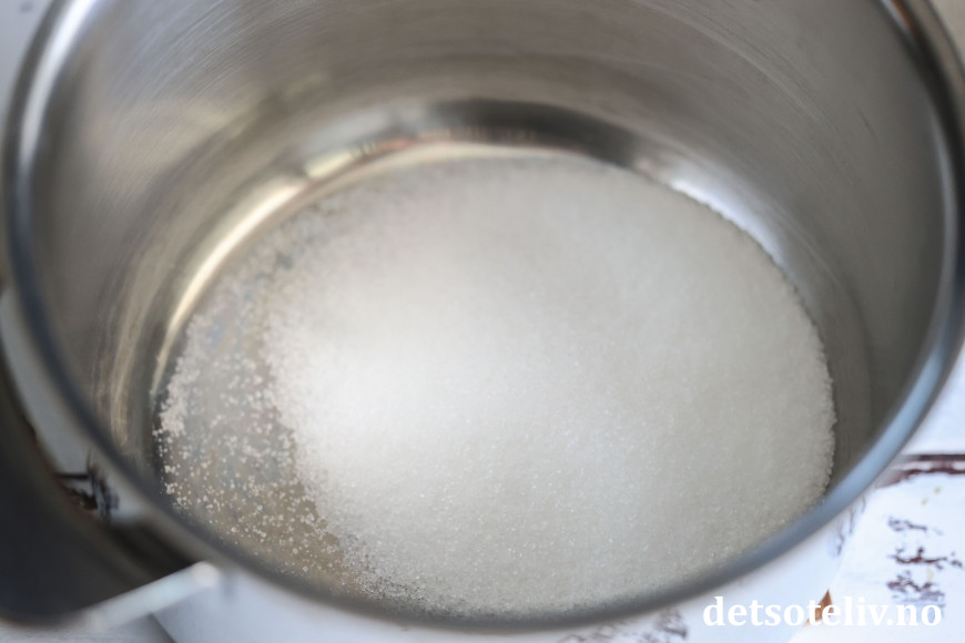 Varme opp sukkeret på middels varme uten å røre i det. Du vil da se at sukkeret smelter etter hvert og gradvis blir lysebrunt og flytende.