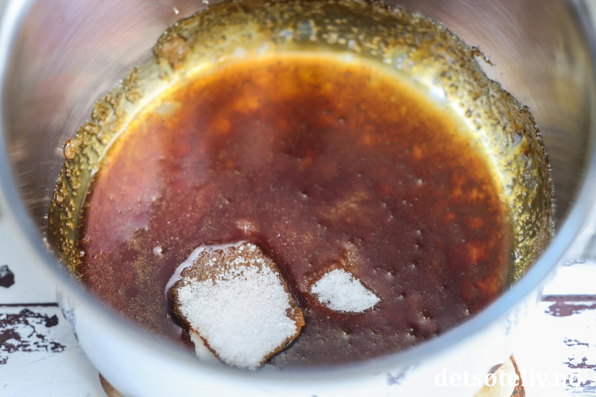 Ha sukkeret i en annen kjele. Varme opp sukkeret på middels varme uten å røre i det. Du vil da se at sukkeret smelter etter hvert og gradvis blir lysebrunt og flytende.
