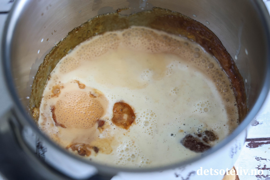 Når sukkeret har smeltet helt, ta kjelen av platen og spe med den varme vaniljefløten, litt om gangen. Det smeltede sukkeret vil bruse opp i starten.