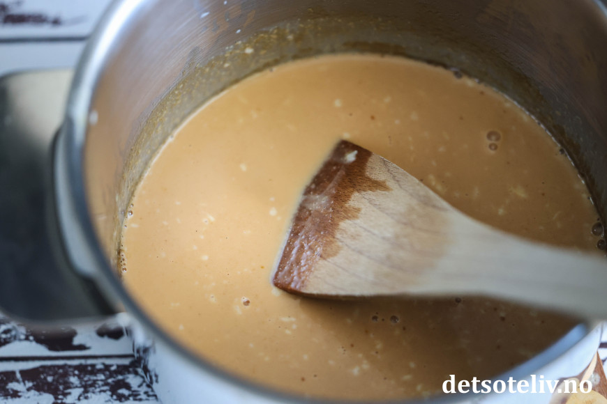 Sett kjelen på platen på nytt og varm opp på middels varme mens du rører med en tresleiv, til du får en glatt karamellsaus.