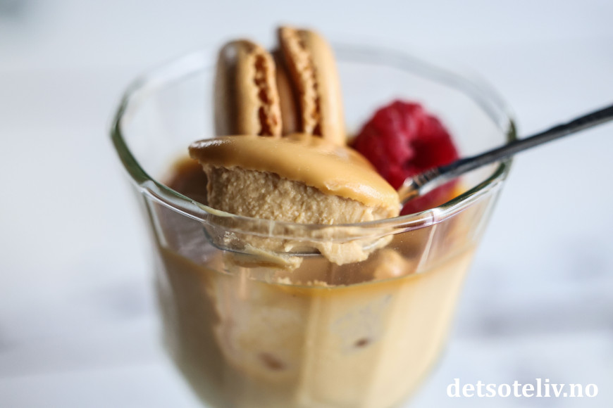 Jeg klarte nok å ødelegge denne desserten, da sukkeret begynte å koke når jeg smeltet det. Hadde varmen på 8 av 14, det var tydeligvis litt for varmt. Det begynte å lukte brent, men jeg hadde dessverre troa på at det skulle gå fint, helt til alt var blandet sammen og jeg skulle til å ha sausen i glass. Kjente da at det smakte veldig brent. Kanskje jeg tør å prøve igjen en gang, og da skal jeg smelte sukkeret på LAV varme.