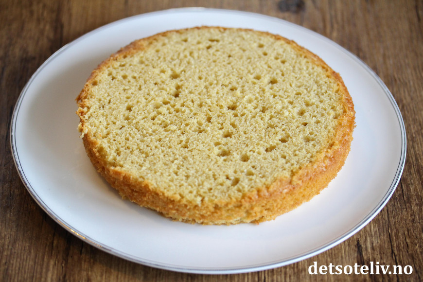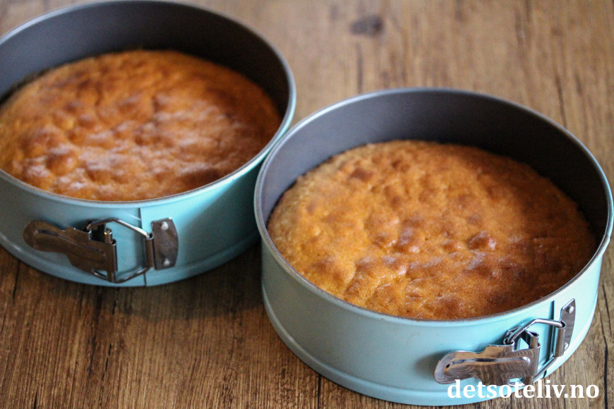Fordel deigen i to runde former (20 cm i diameter) med bakepapir i bunnen. Stek kakene midt i ovnen ved 180°C i ca. 30 minutter, til kakene er gylne og gjennomstekte. La kakene avkjøles og ta de ut av formene.