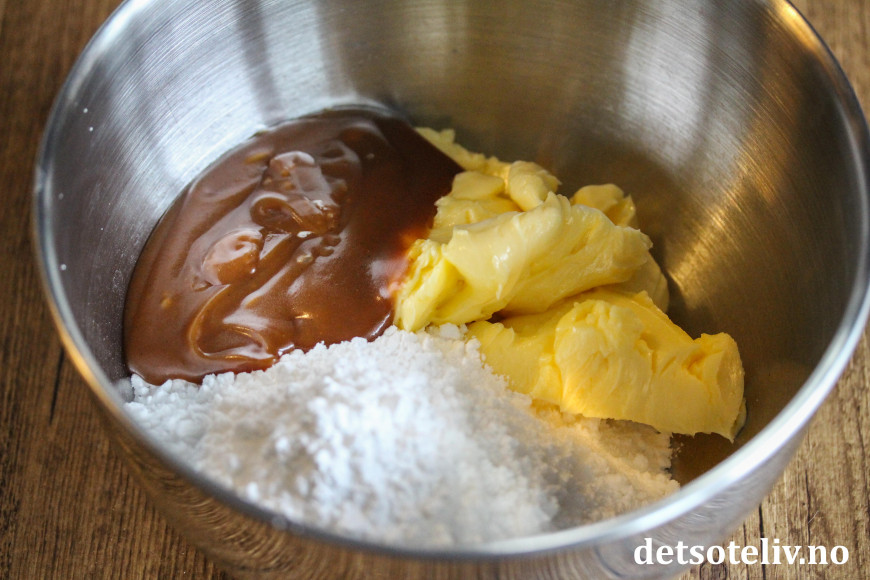 Ha mykt smør, karamellsaus (som nå er tykk etter å ha stått i romtemperatur over natten) og melis i en bolle.
