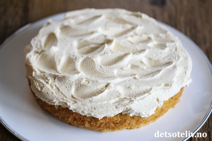 Fordel karamellsmørkrem på den nederste kakebunnen.