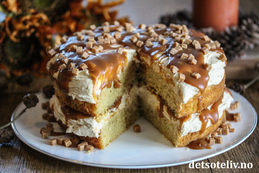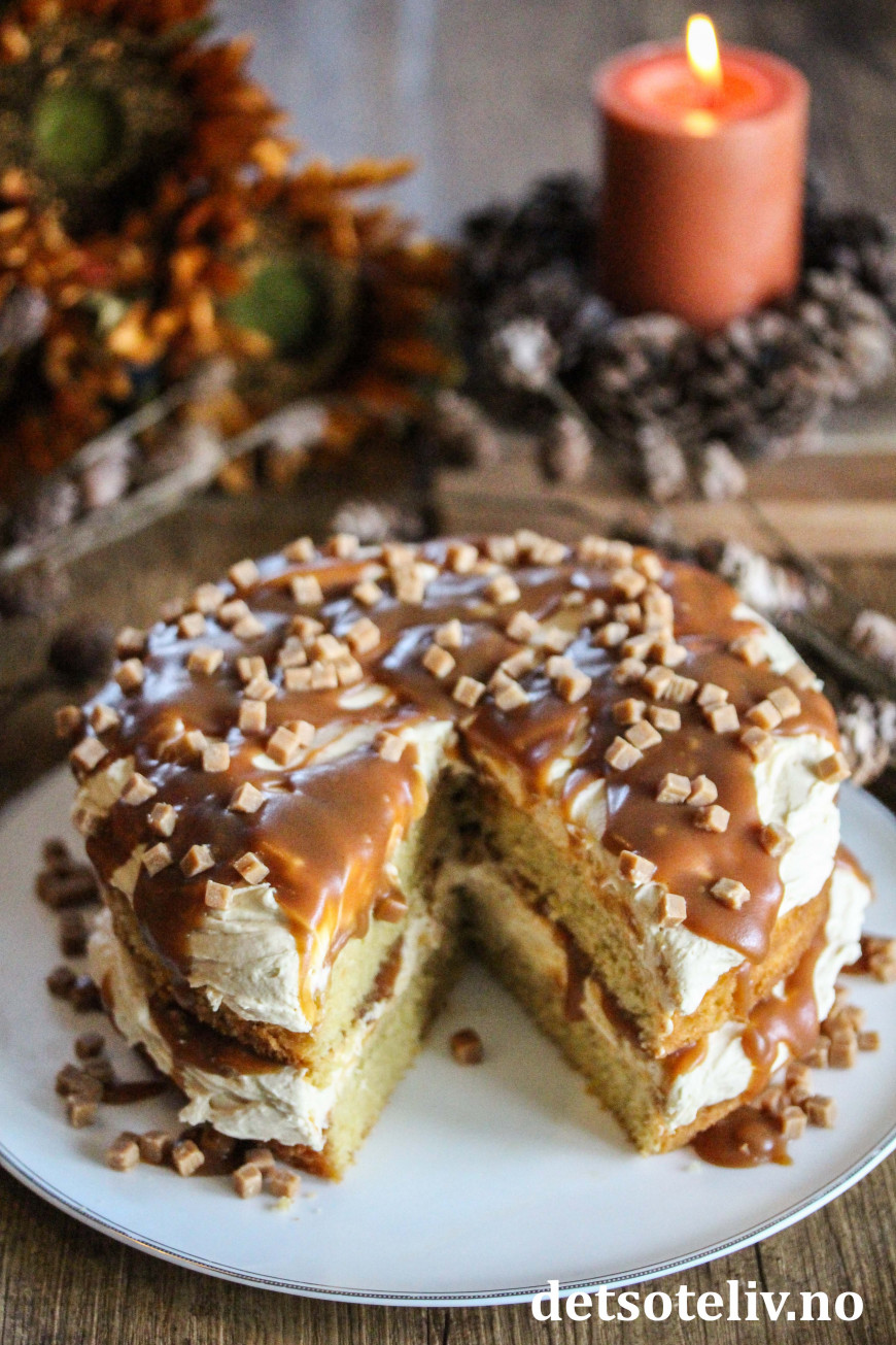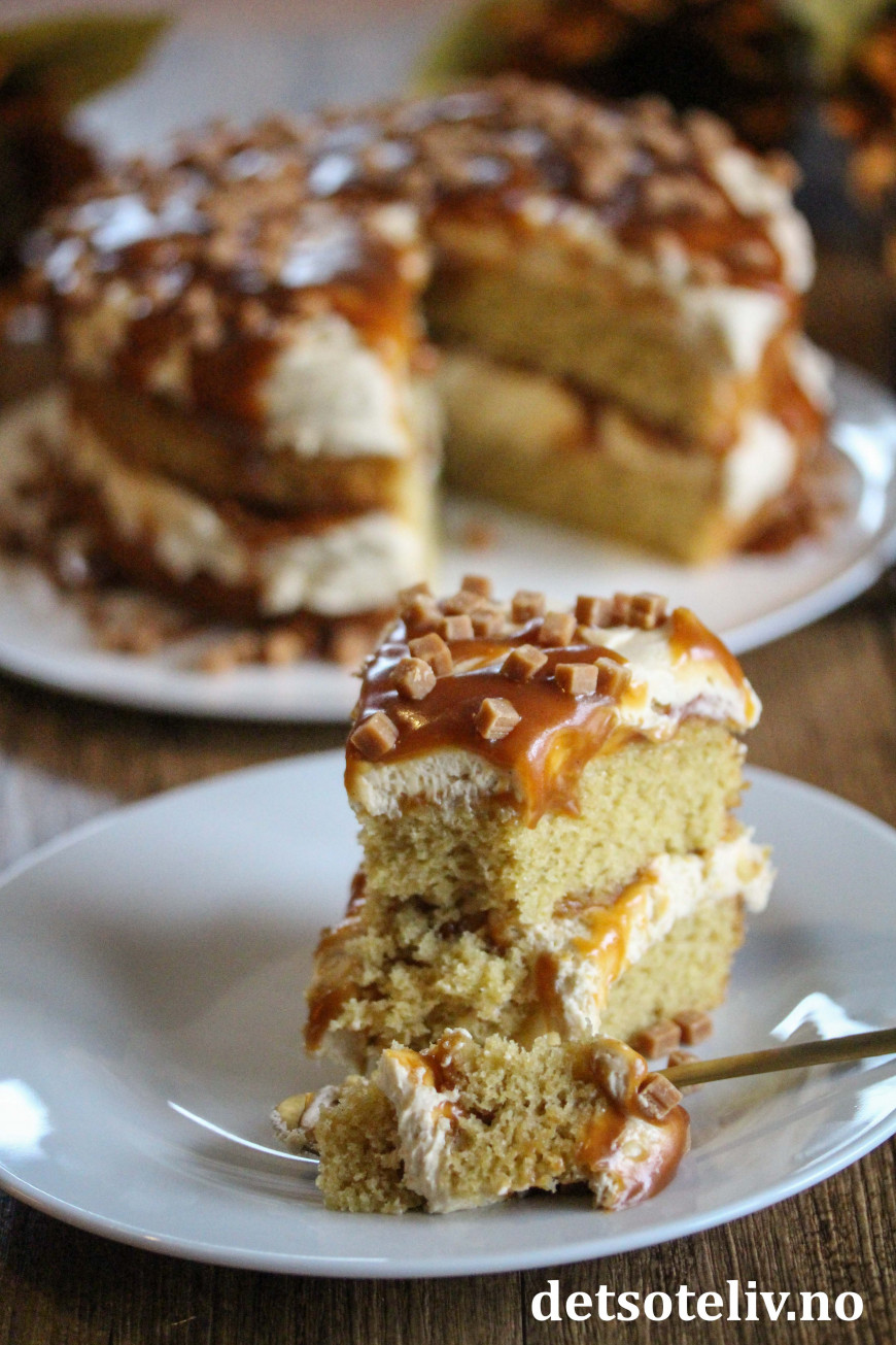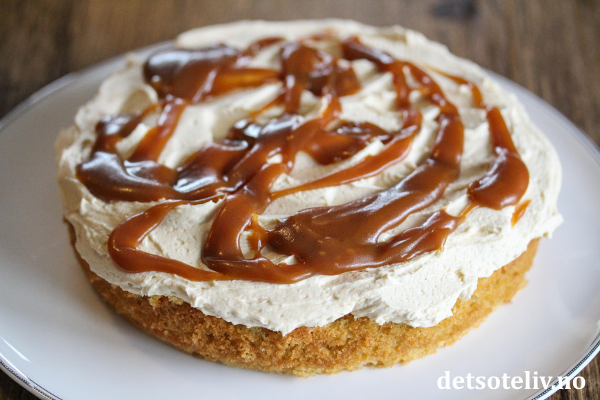 Karamellsausen blander seg herlig med kake og karamellkrem når man skjærer i kaken...