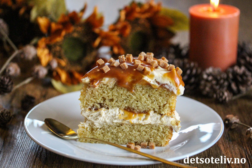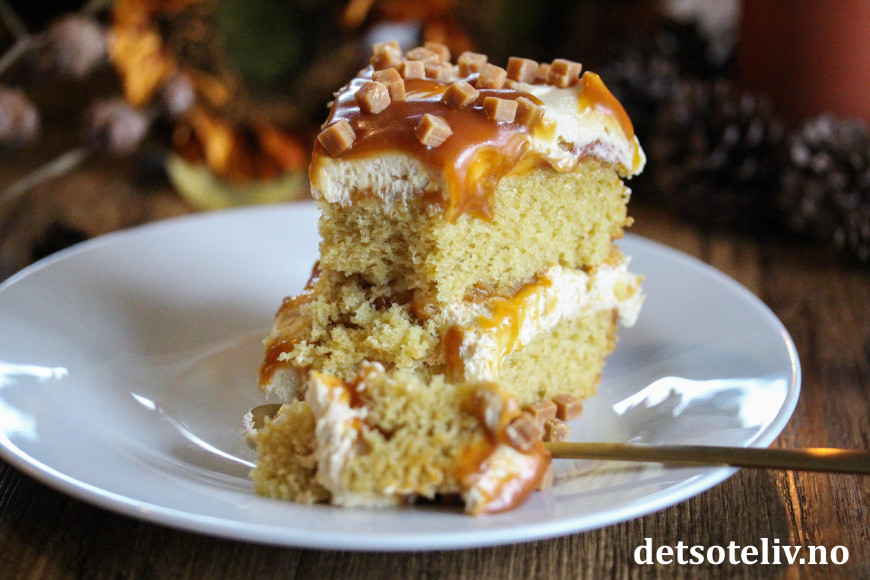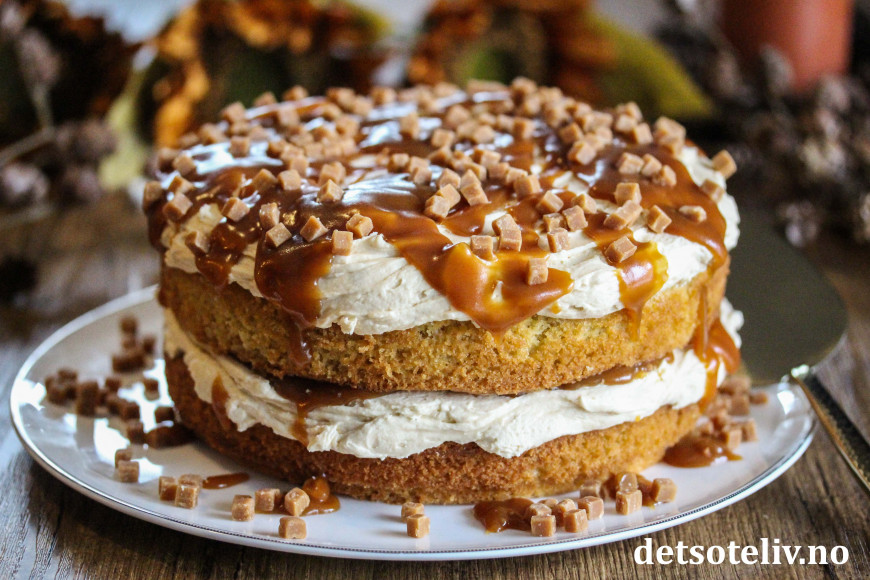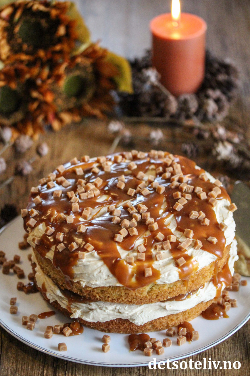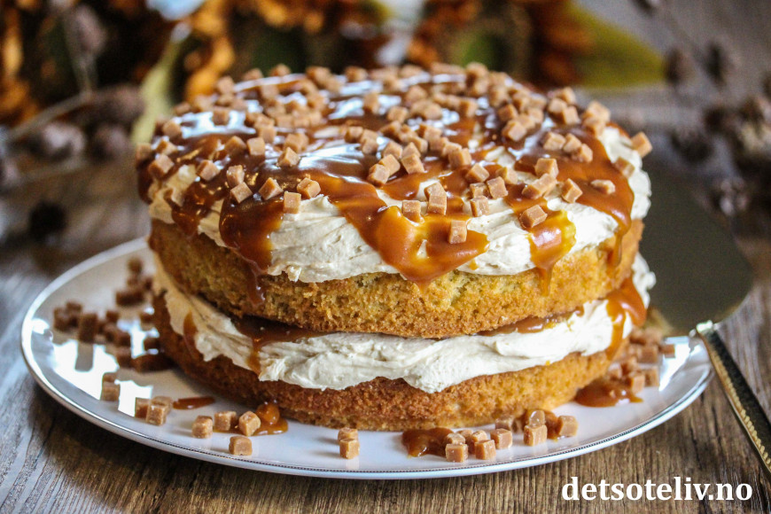 Karamellsausen blander seg herlig med kake og karamellkrem når man skjærer i kaken...