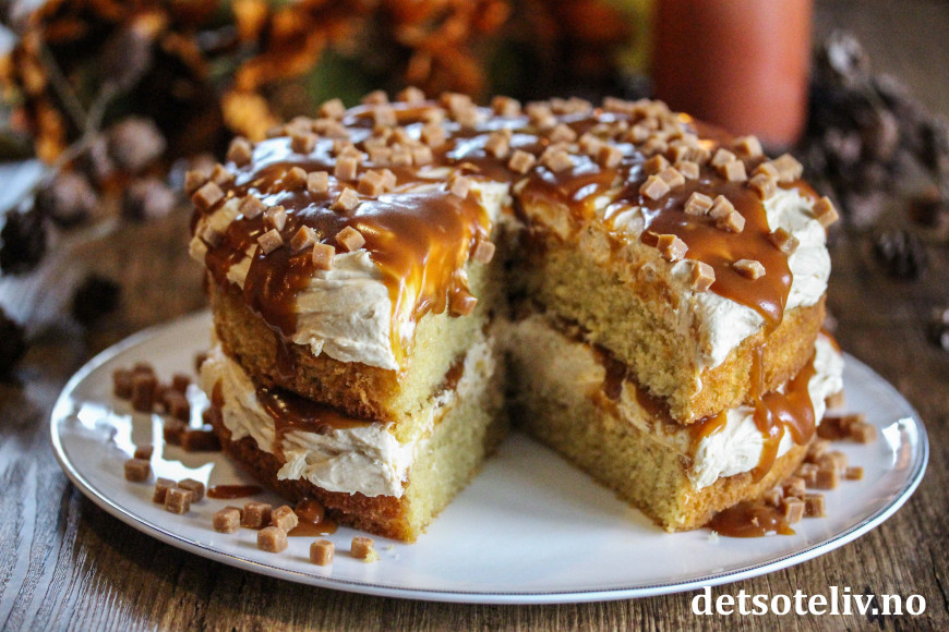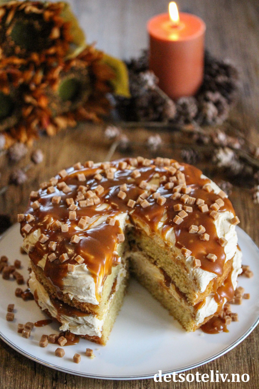 Denne herlige karamellkaken består av myke vaniljebunner, som lages med brunt sukker. Mellom kakelagene fyller jeg med en supergod karamellsmørkrem og en helt herlig, tykk karamellsaus.