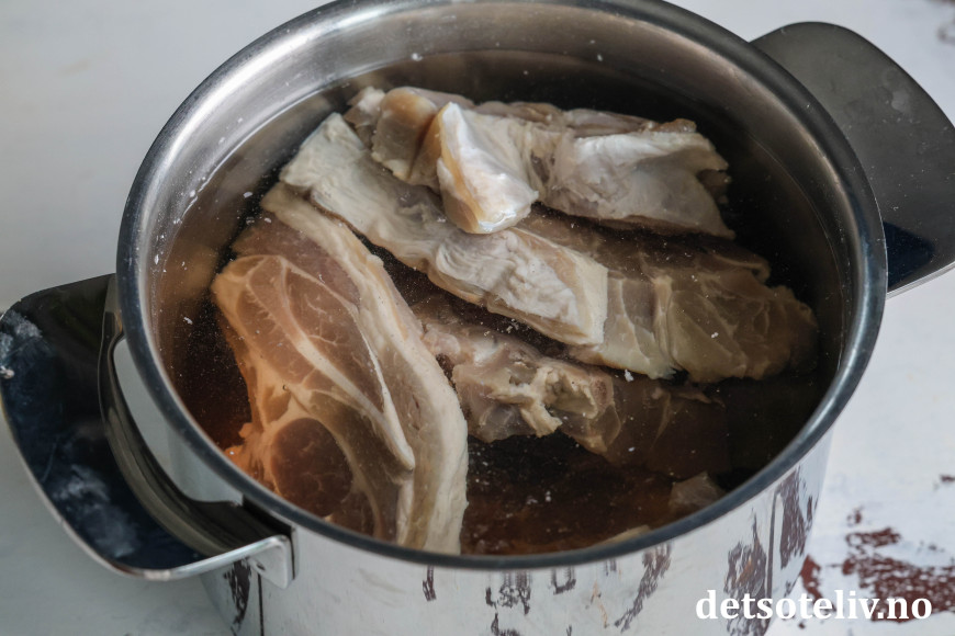 Hell av vannet og fyll på med nytt vann (ikke ha salt i vannet, for kjøttet er salt nok i seg selv).