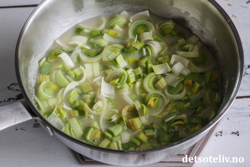 Rens og kutt opp purreløk og ha i kjelen.