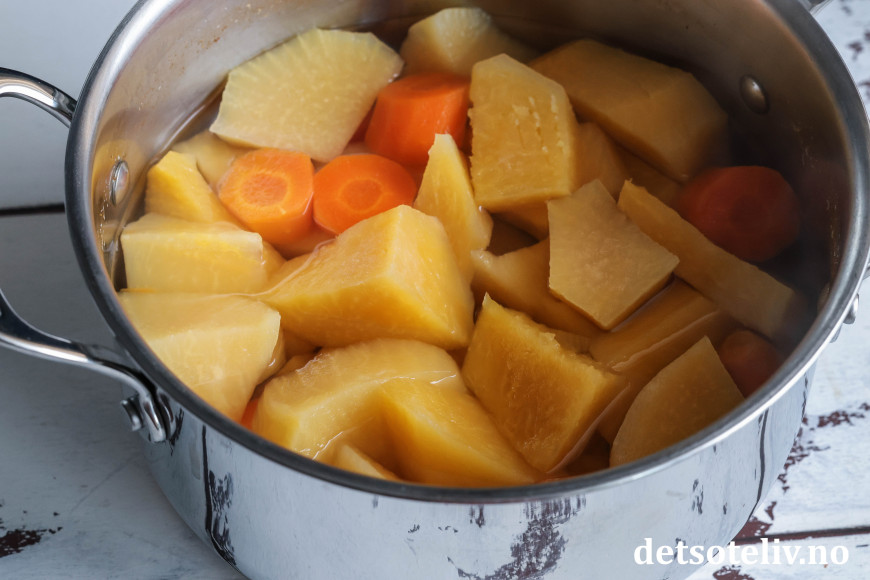 Rens kålrot og gulrøtter og del i mindre biter. Ha bitene i en kjele med lett saltet vann og kok dem helt møre.