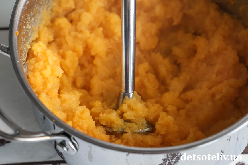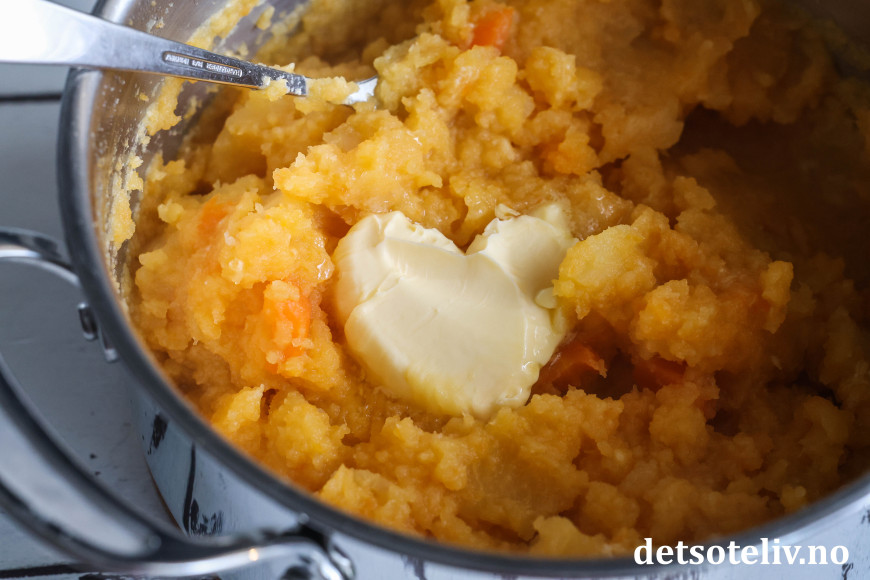 Hell av vannet og mos kålroten og gulrøttene til en stappe (bruk gjerne en stavmikser til dette).