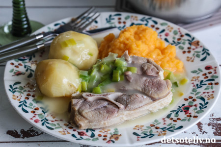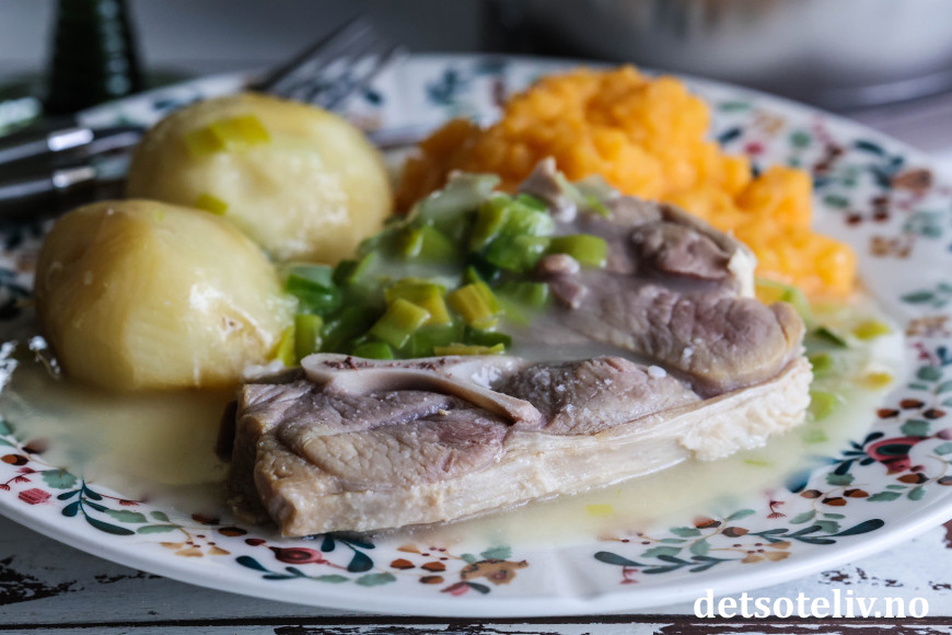 ♥ Det kan variere hvor salt det salte lammekjøttet er, derfor kan kjøttkraften fra det kokte lammekjøttet bli nokså salt. Spe derfor gradvis med kjøttkraft når du lager sausen, og smak til sausen underveis. Bytt eventuelt ut noe av kjøttkraften med vann dersom du kjenner at sausen er tilstrekkelig salt.