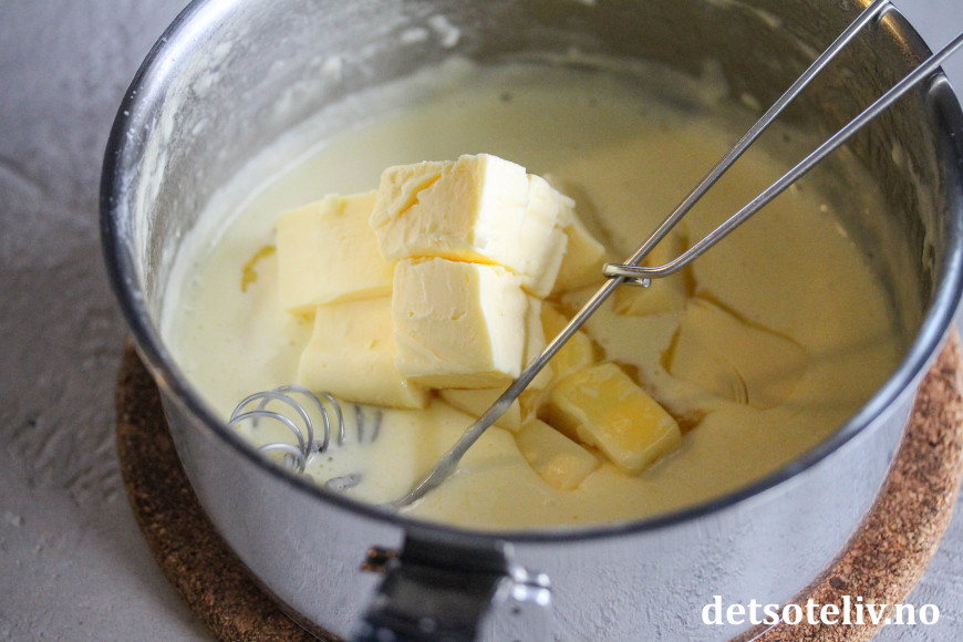 Pisk inn smør i terninger. Ha i noen terninger av gangen og pisk godt for hånd mens smøret smelter og blander seg med fløten.