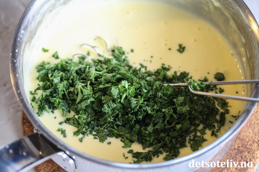Når alt smøret er pisket inn, smaksettes sausen med sitronsaft, salt og hvit pepper og hakket persille.