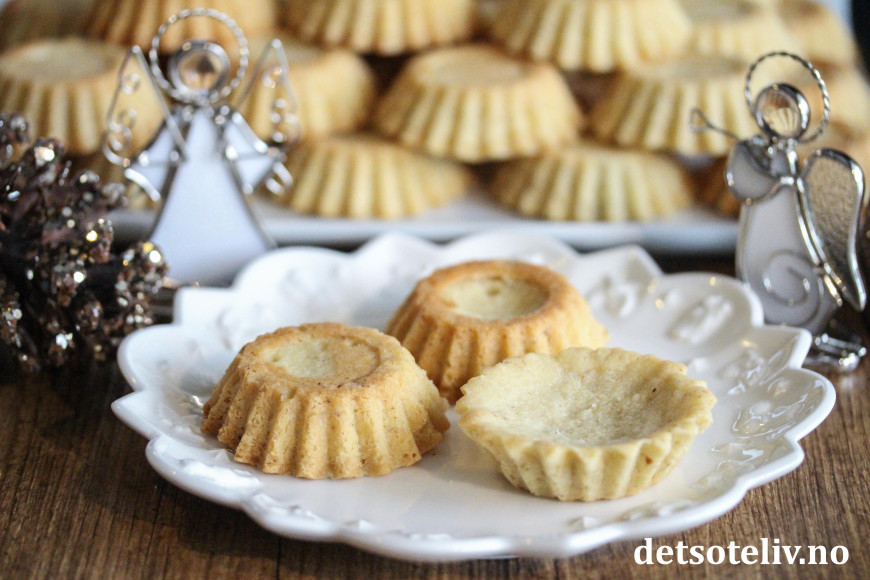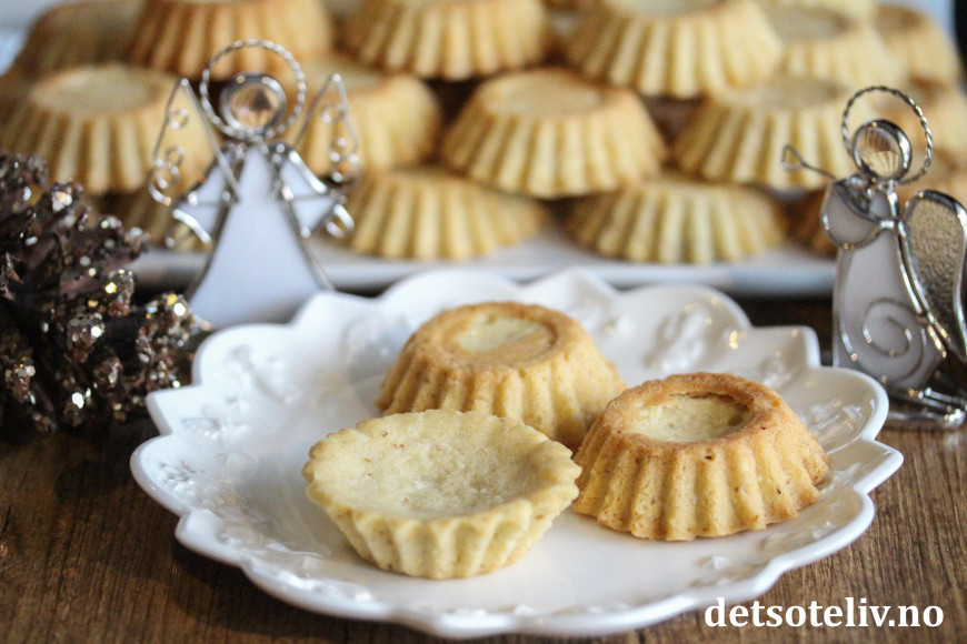 Del deigen opp i 50 like store biter. Trykk hver bit ut i bunn og kanter på sandkakeformer. Jevn til deigen på øverst på formene med fingrene slik at kakene får en jevn kant.