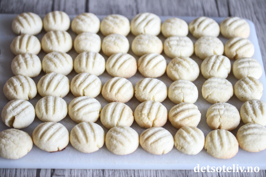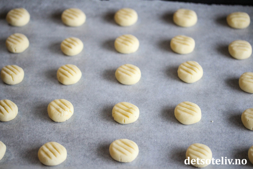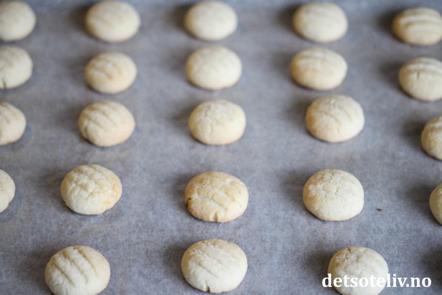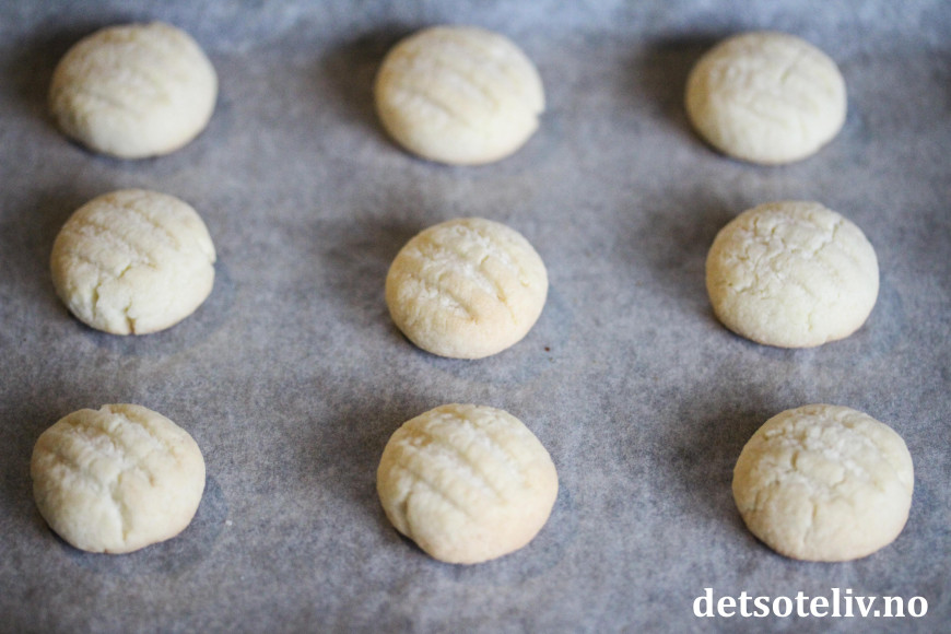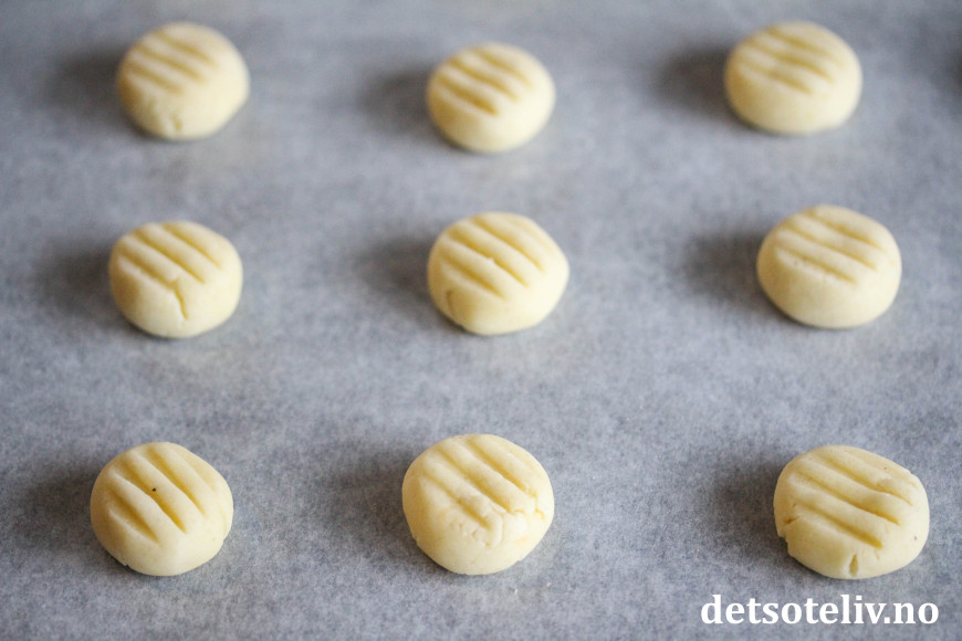 Trill små kuler som settes på stekeplate dekket med bakepapir (jeg bruker ca. 9 gram deig per kule). Ikke sett mer enn ca 25 stk på hver plate fordi kakene eser litt ut under steking. Trykk kakene lett ned med en gaffel så de får rillemønster på toppen.