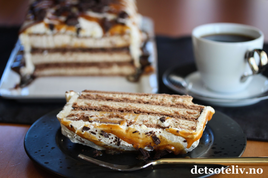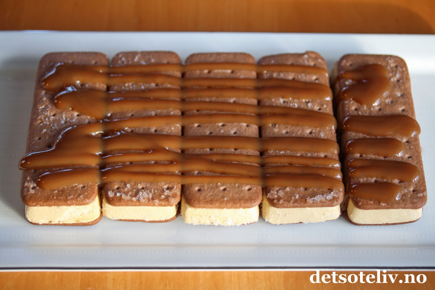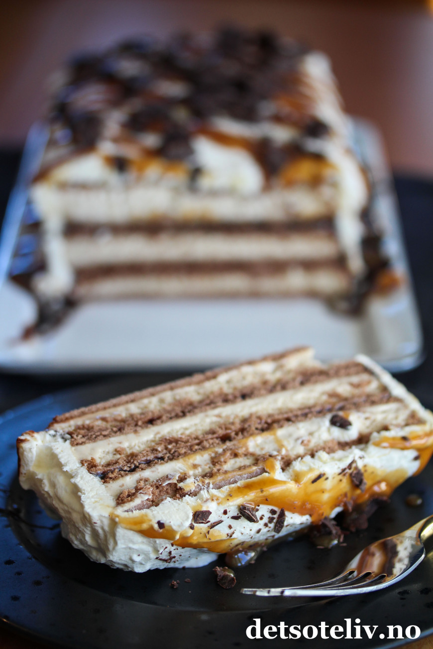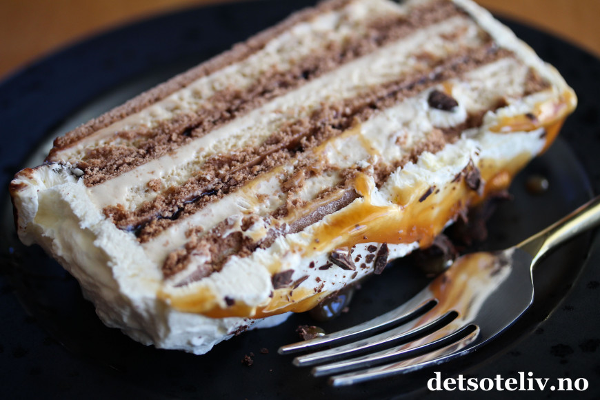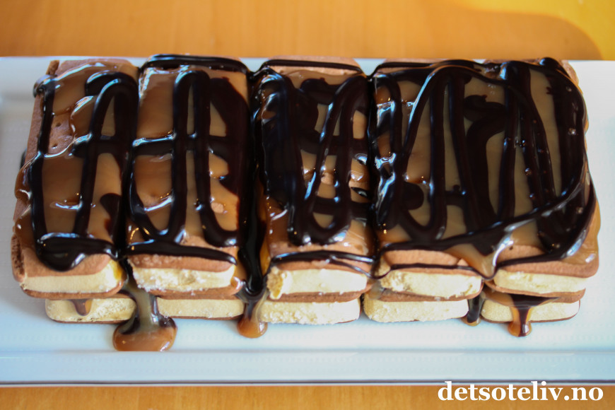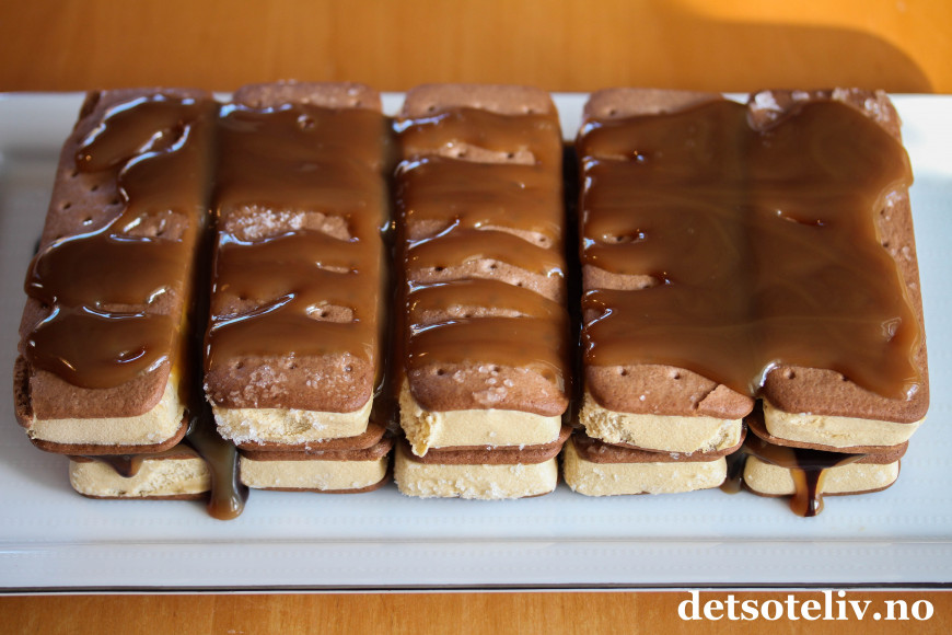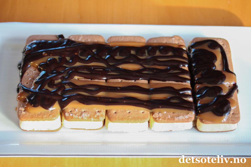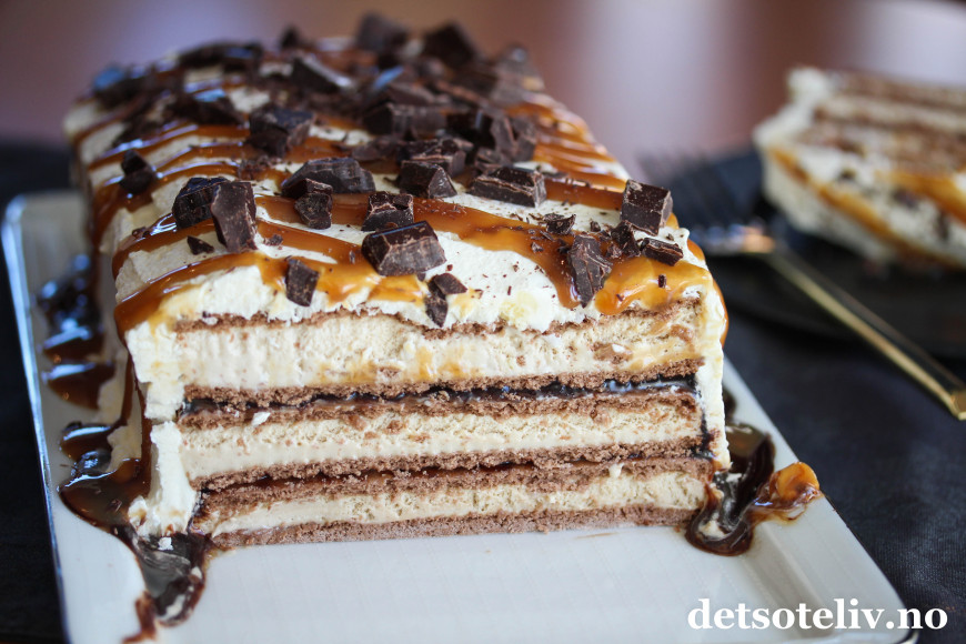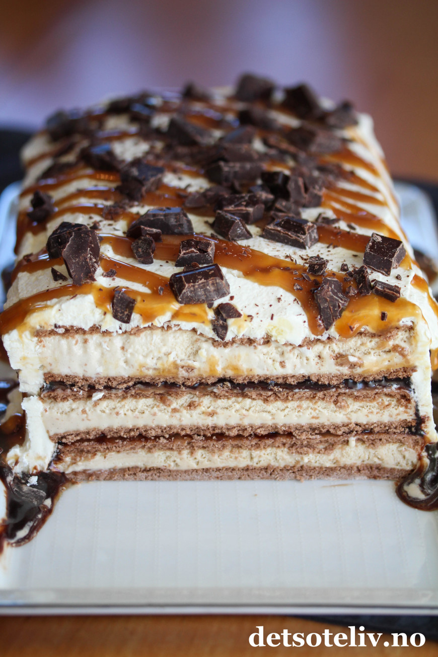 Denne iskaken består kun av sandwich-is, karamellsaus, sjokoladesaus og pisket krem. Å sette sammen dette til en iskake, tar bare noen få minutter. Deretter står iskaken i fryseren mens du kan ordne andre ting.