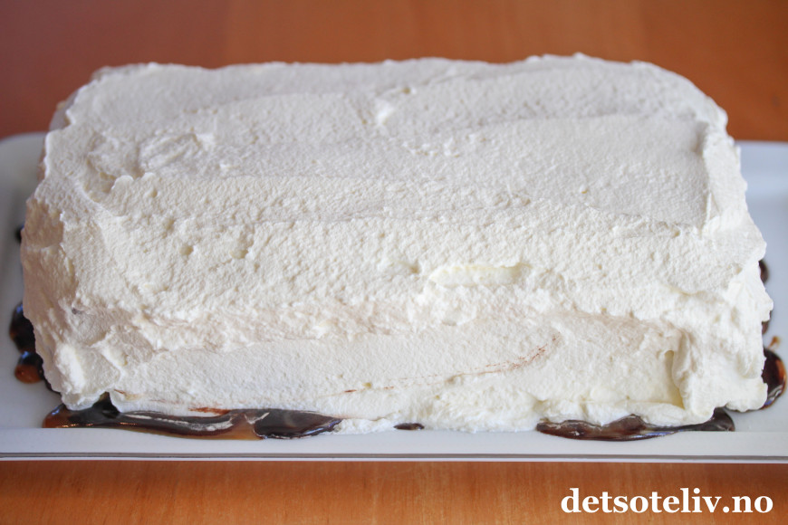 Pisk kremfløten til krem. Ta iskaken ut av fryseren og dekk hele med pisket krem. Sett iskaken tilbake i fryseren og la den stå der i minst 4 timer.