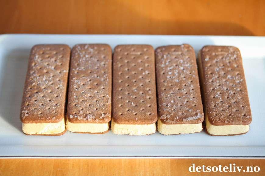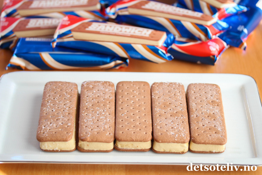 ♥ Sandwich-is får du kjøpt i de fleste matbutikker og består av iskrem mellom to myke kjeks.