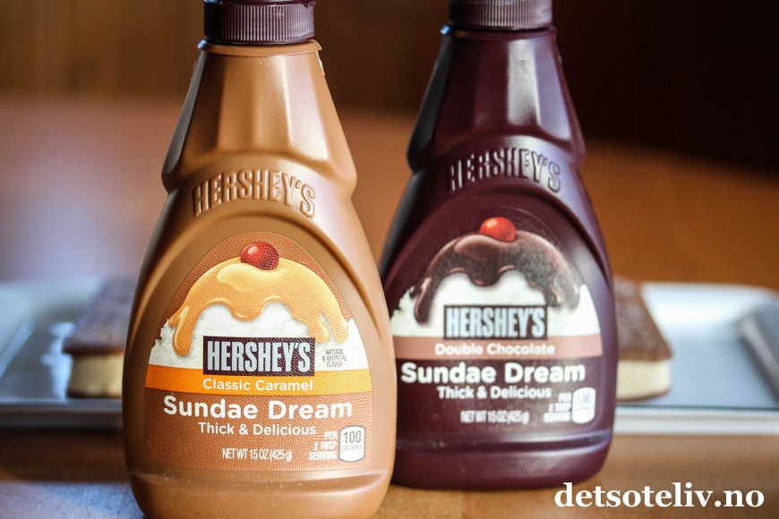 ♥ Videre brukte jeg denne type amerikansk karamellsaus og sjokoladesaus på flaske fra Hershey's. Fås blant annet kjøpt hos Meny.