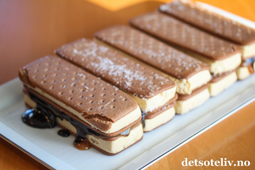 Legg på 5 stykk sandwich-is til.