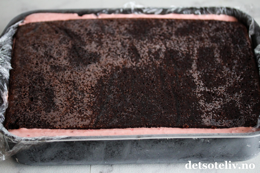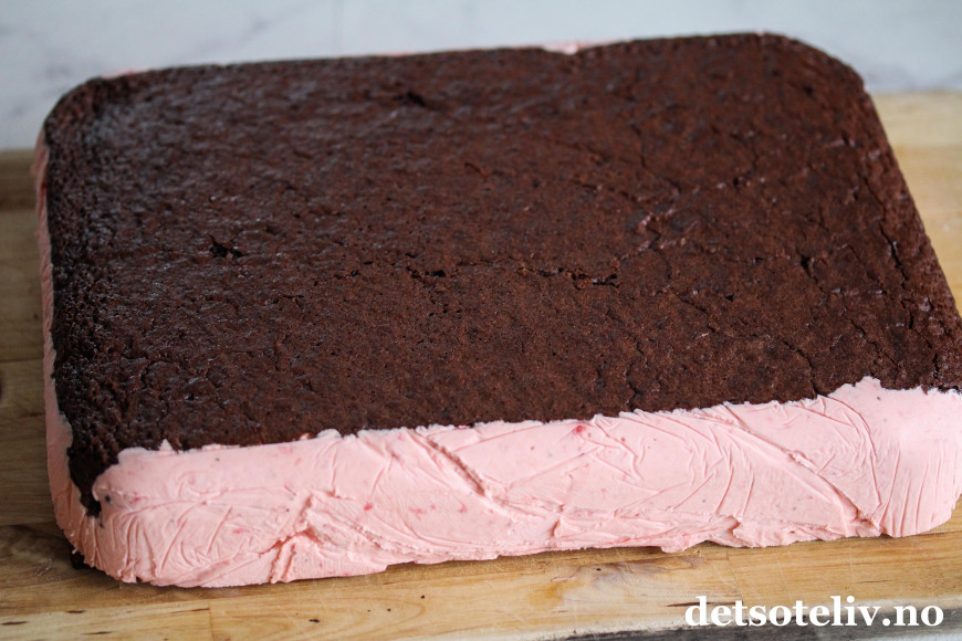 Avkjøl kaken til den er helt kald. Hvelv den deretter ut av langpannen, dra av bakepapiret, og del kaken på midten så du får to deler (som altså da blir halvparten så store som den opprinnelige kaken og som dermed passer i en liten langpanne).